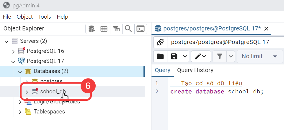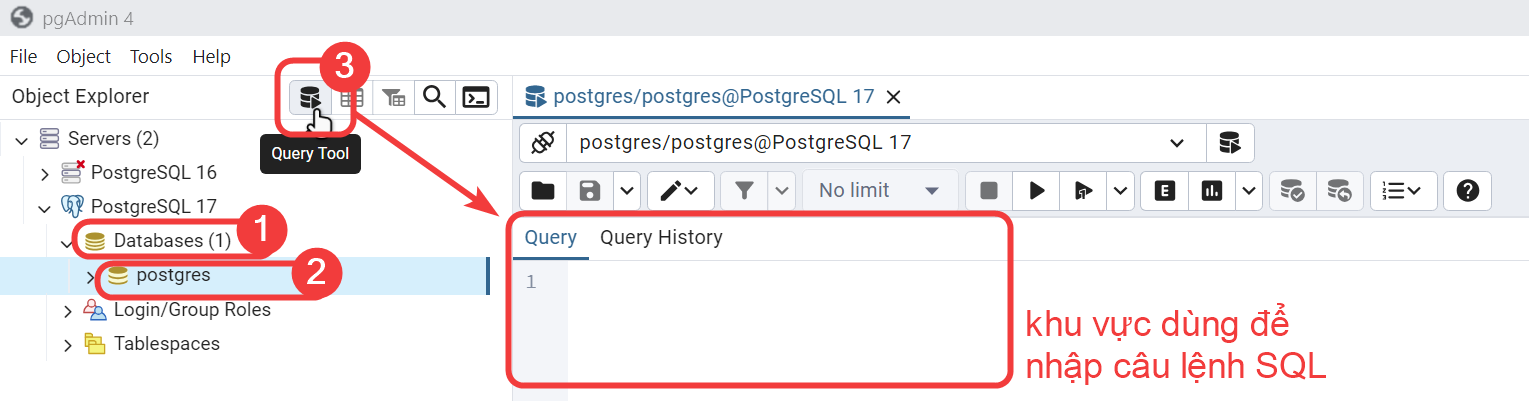 Hãy luôn bảo đảm mở Query Tool từ đúng cơ sở dữ liệu mà mình muốn làm việc để tránh việc tạo bảng nhầm vô cơ sở dữ liệu hệ thống postgres.