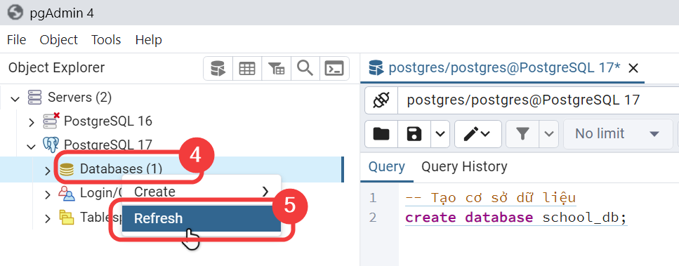 Kết nối server trong pgAdmin 4