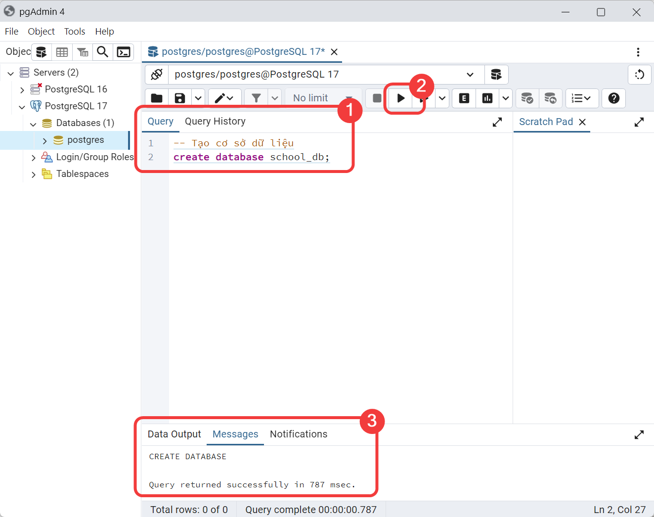 Nếu thấy thông báo đại loại như Query returned successfully in 787 msec thì ta biết rằng các câu lệnh đã thực thi thành công.