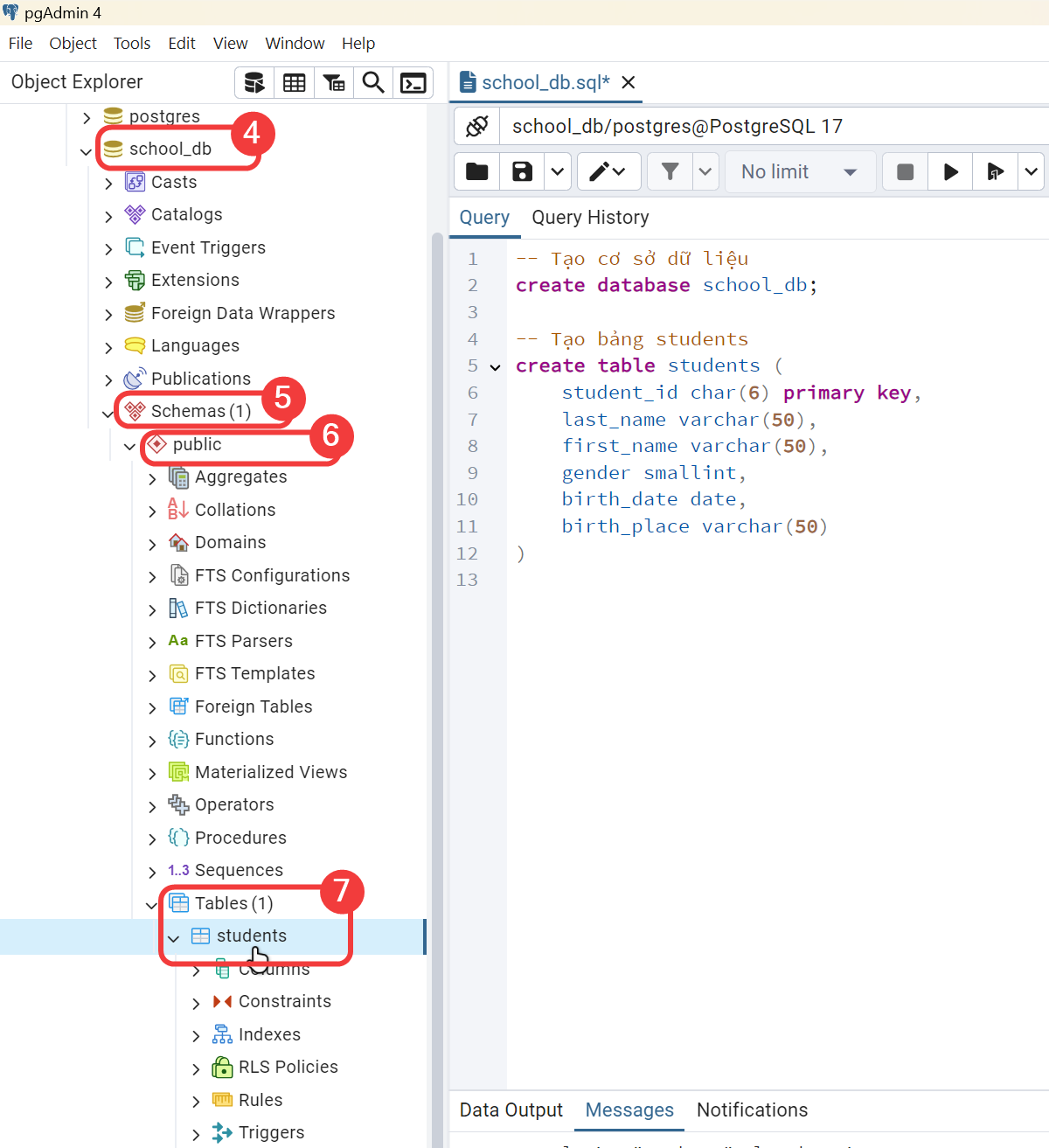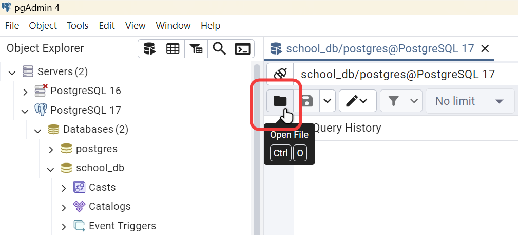 Một tab mới sẽ mở ra, tiêu đề có dạng school_db/postgres@PostgreSQL 18 (1).