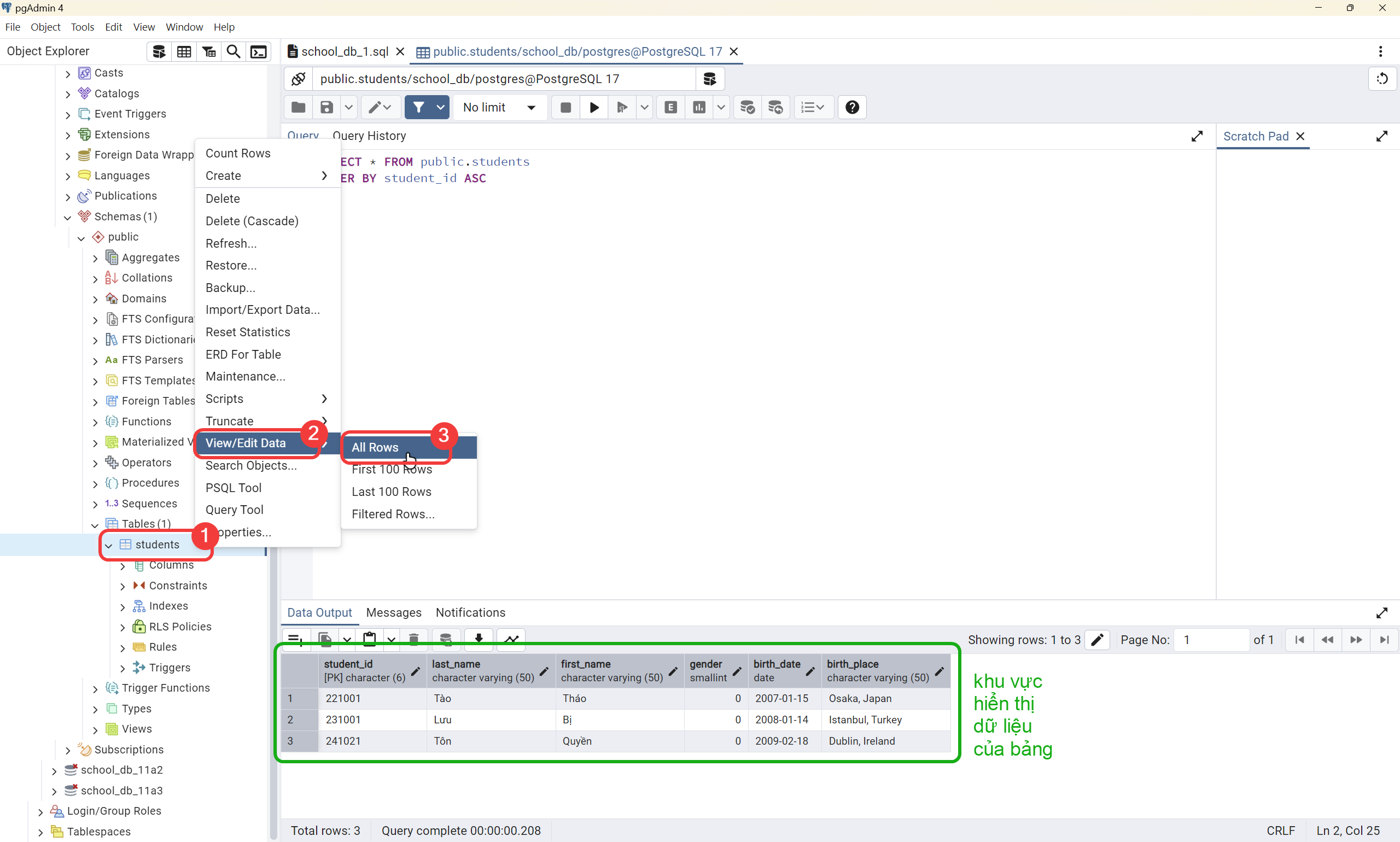 Như vậy, cơ sở dữ liệu school_db đã có một bảng là students. Bảng này đang lưu trữ ba mẫu tin, là dữ liệu của ba học sinh.