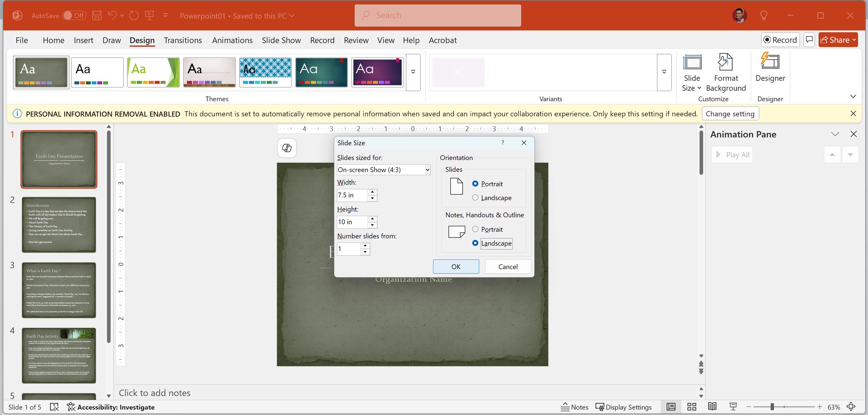 Change the Page Setupto have a Custom size of 7.5 (19.05 cm) width x 10 (25.4 cm) height and an orientation of the notes, handouts & outline to be Landscape. Ensure the content fits the new slide size.