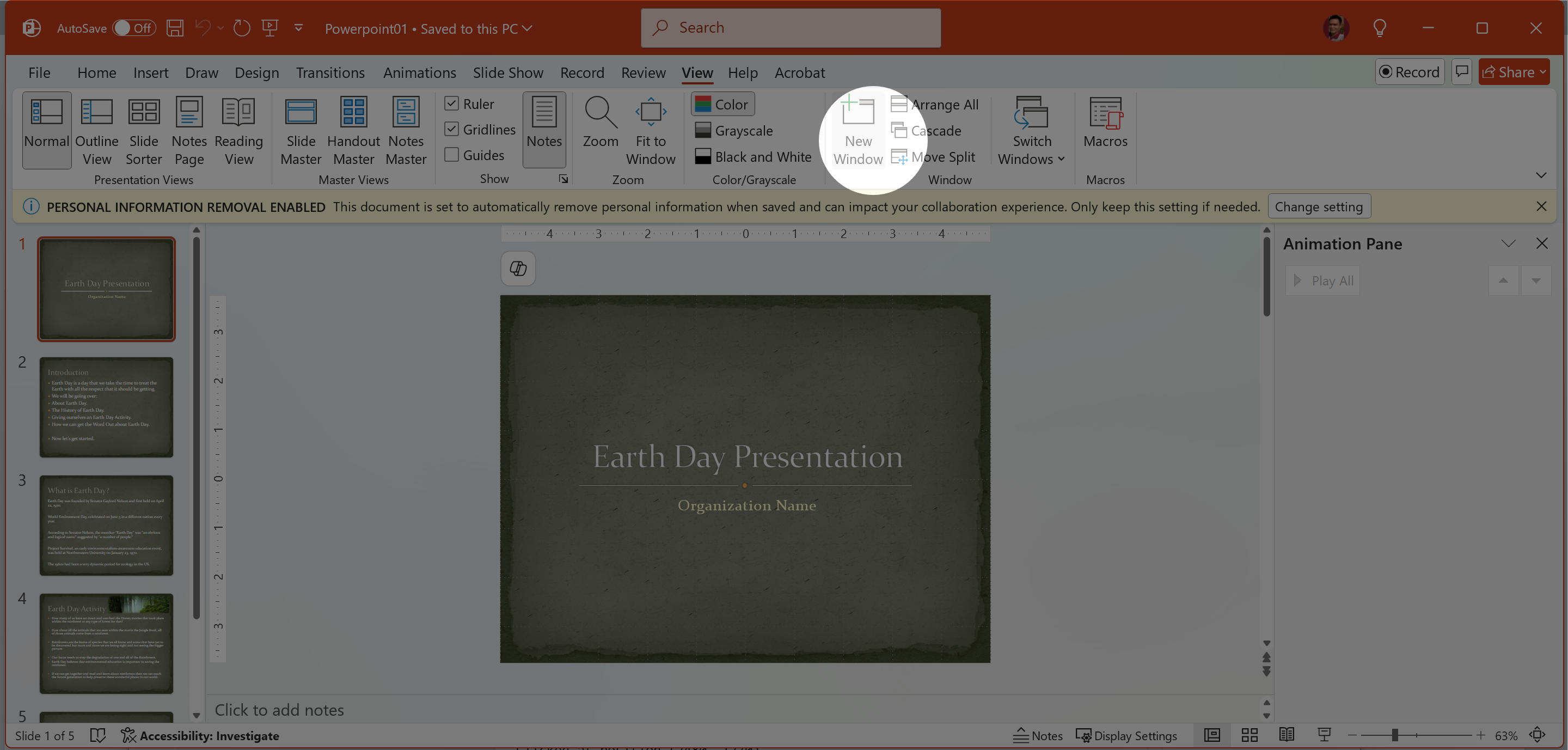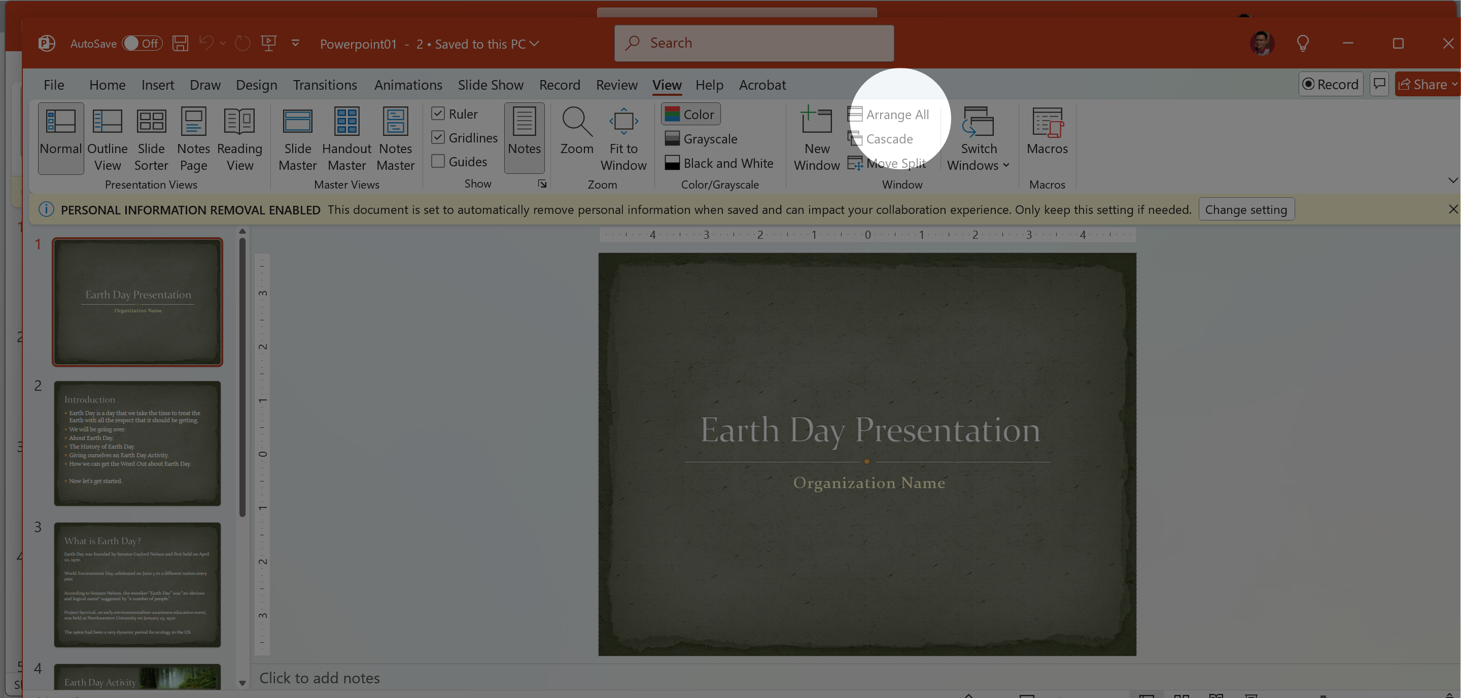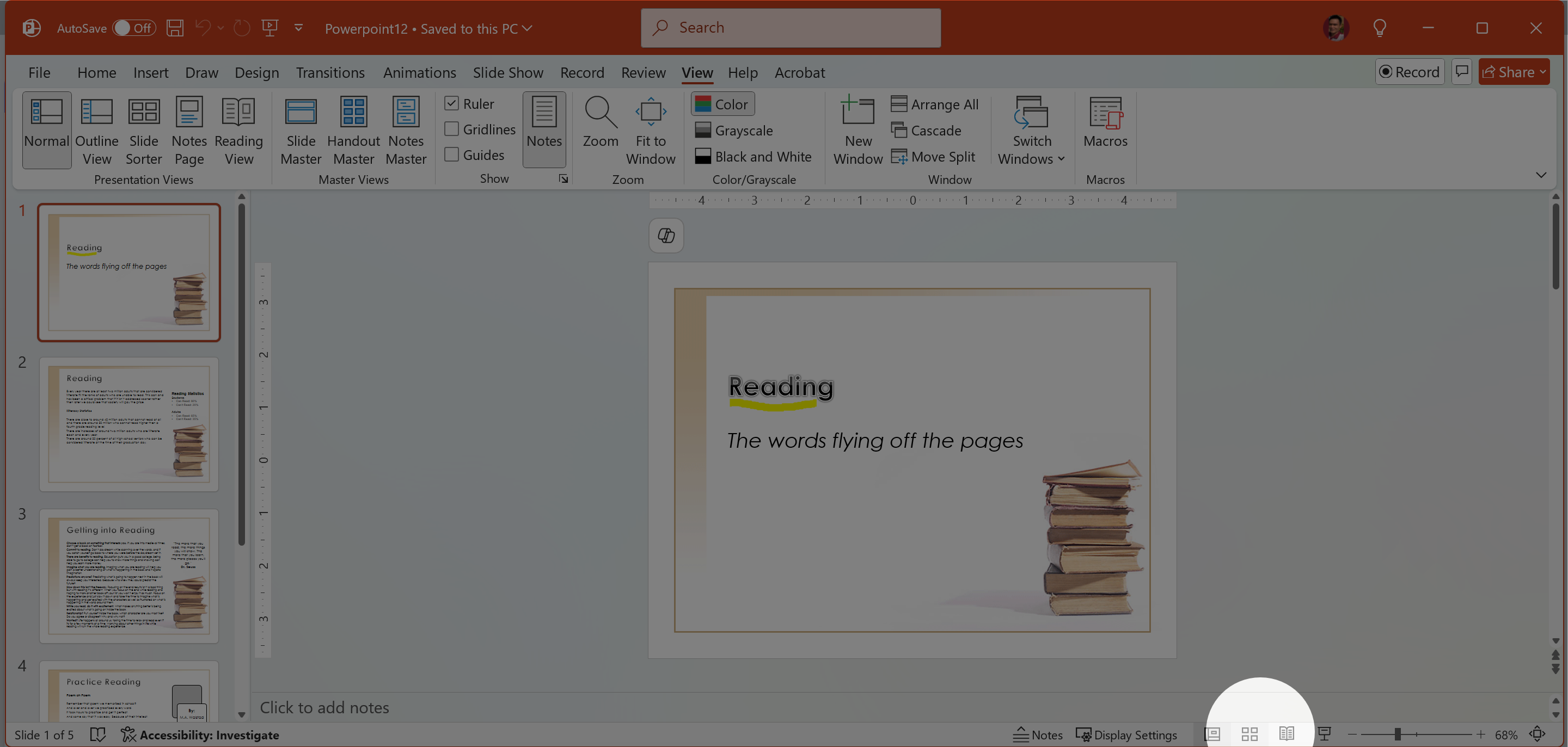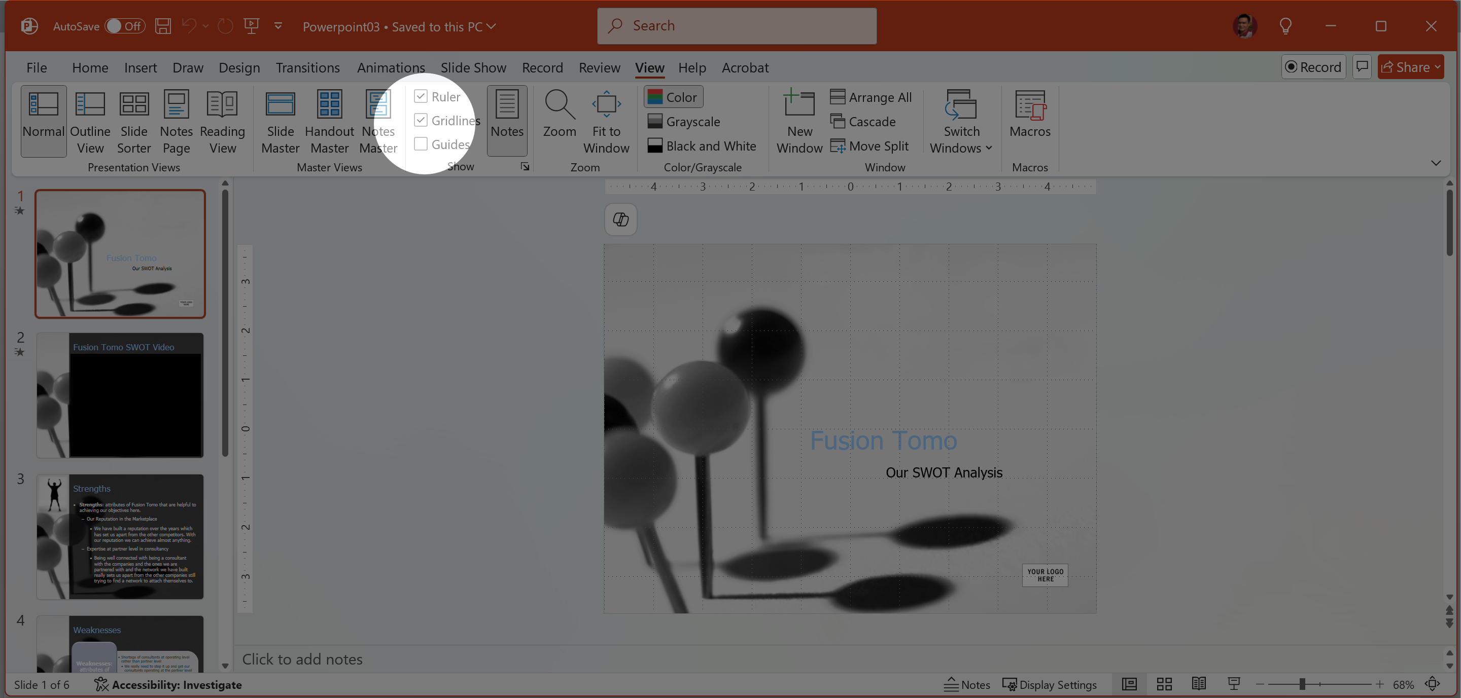 Change the view of the slideshow to Grayscale, and show Gridlines.