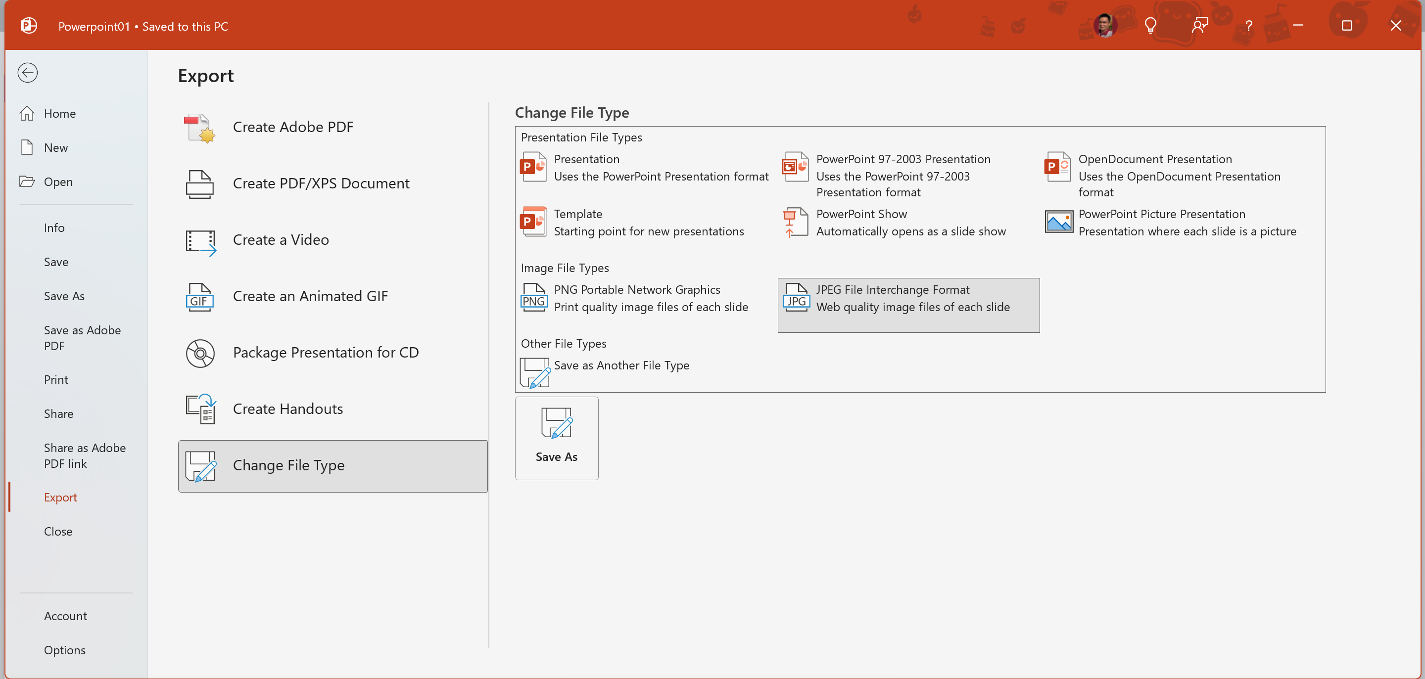 2. File tab > Export > Change File Type > JPEG File Interchange Format (*.jpg) > Save As.