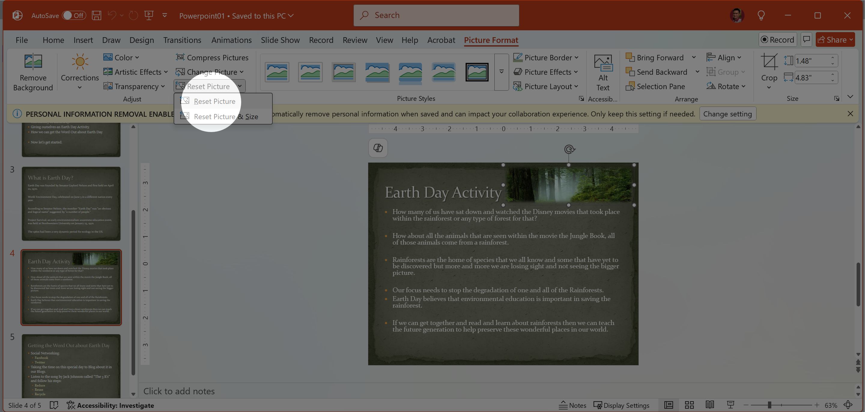 2. Picture Format tab > Reset Picture.