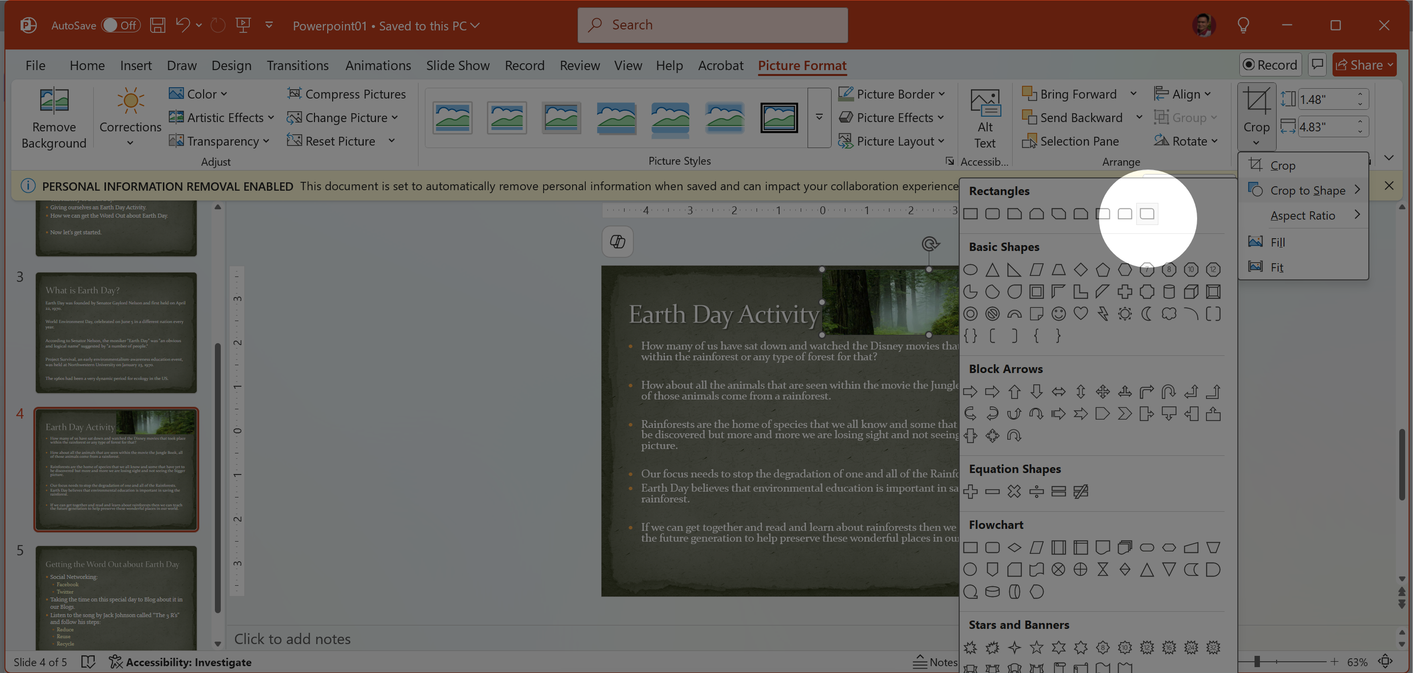 On Slide 4 Reset the Picture and then Crop the picture to a Shape named Round Diagonal Corner Rectangle