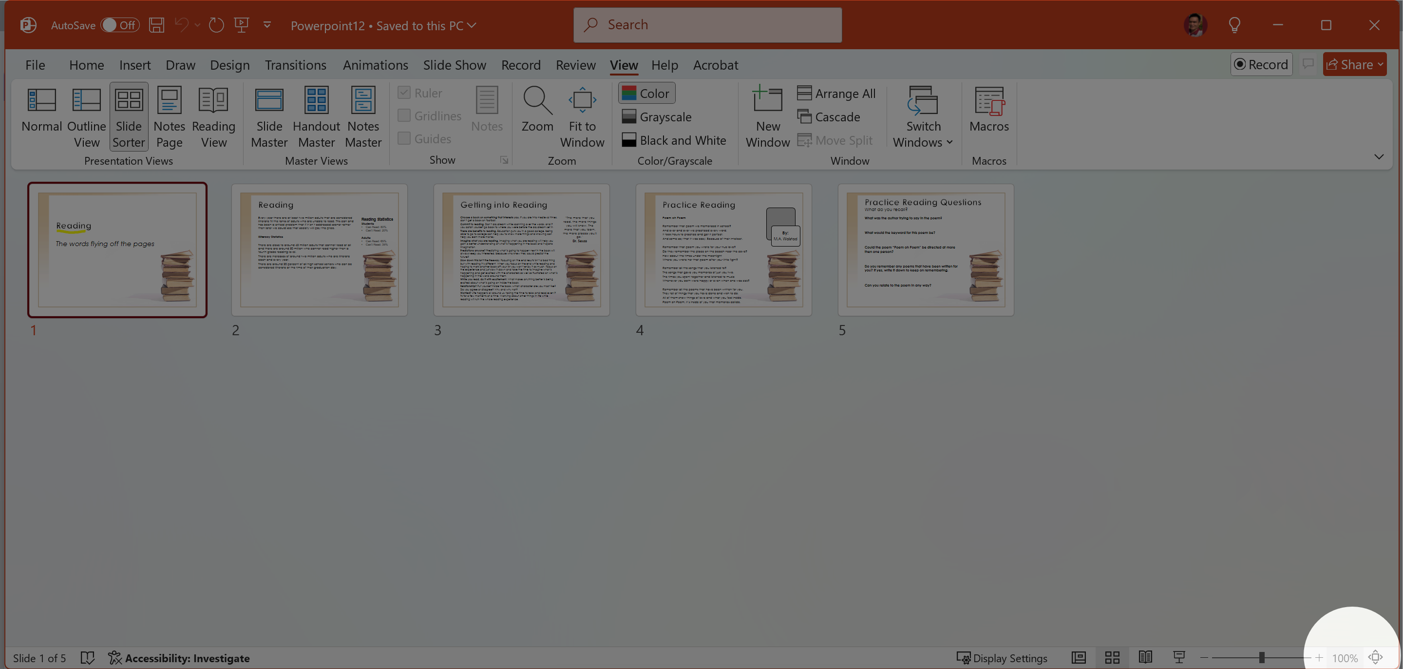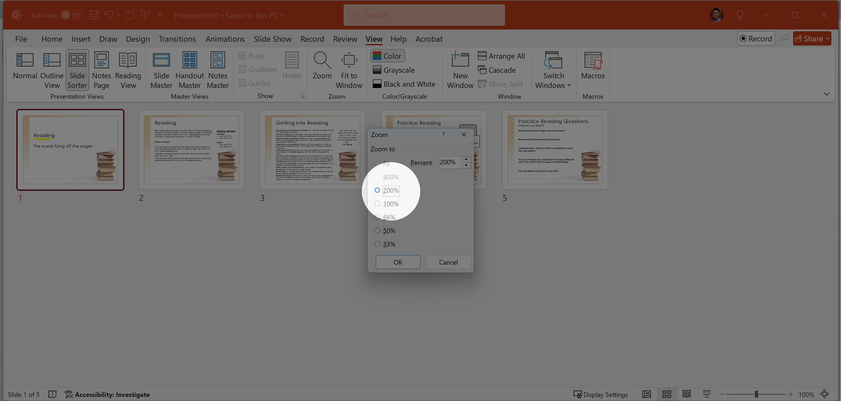 Change the view to Slide Sorter and change the Zoom to 200%.