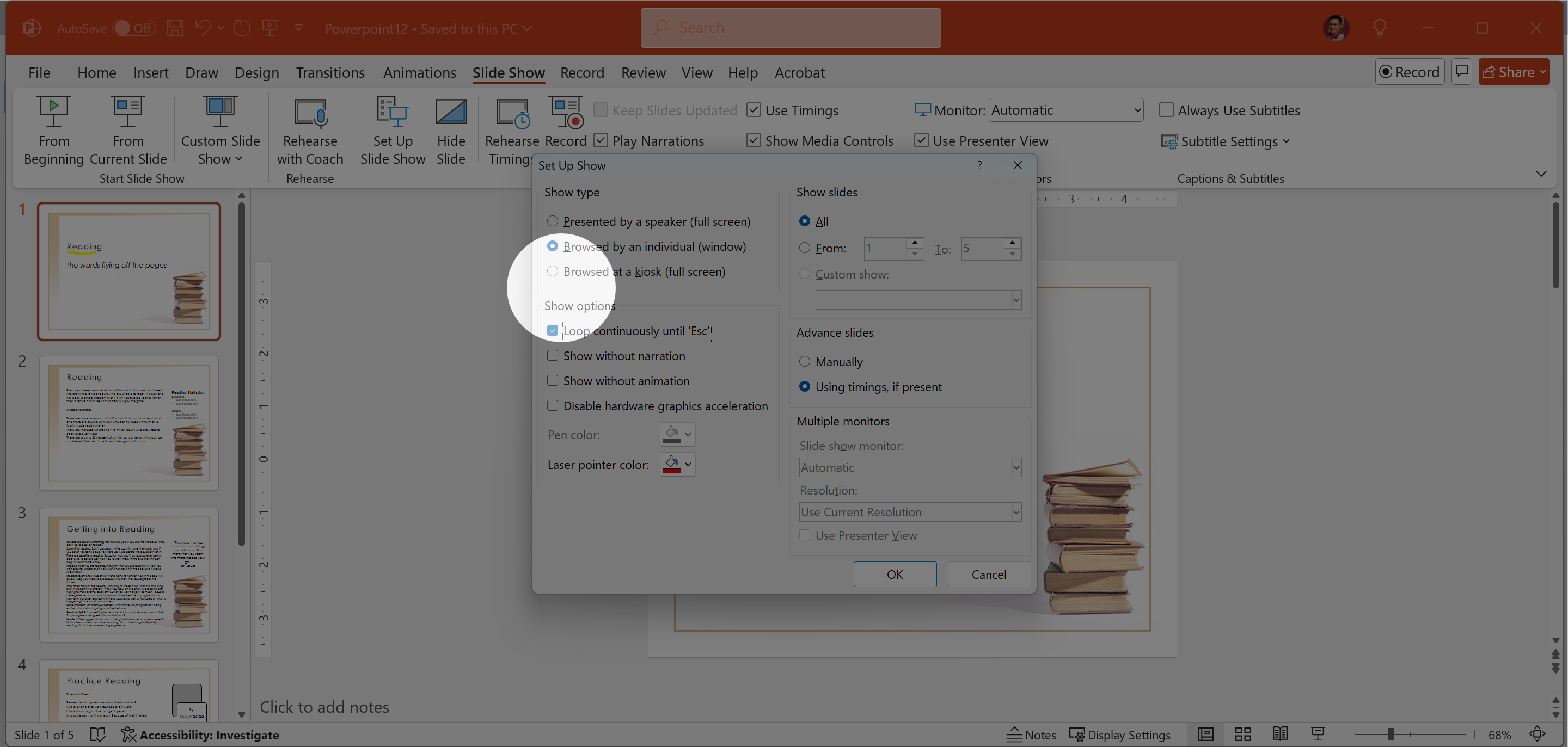 1. Slide Show tab > Set Up Slide Show.