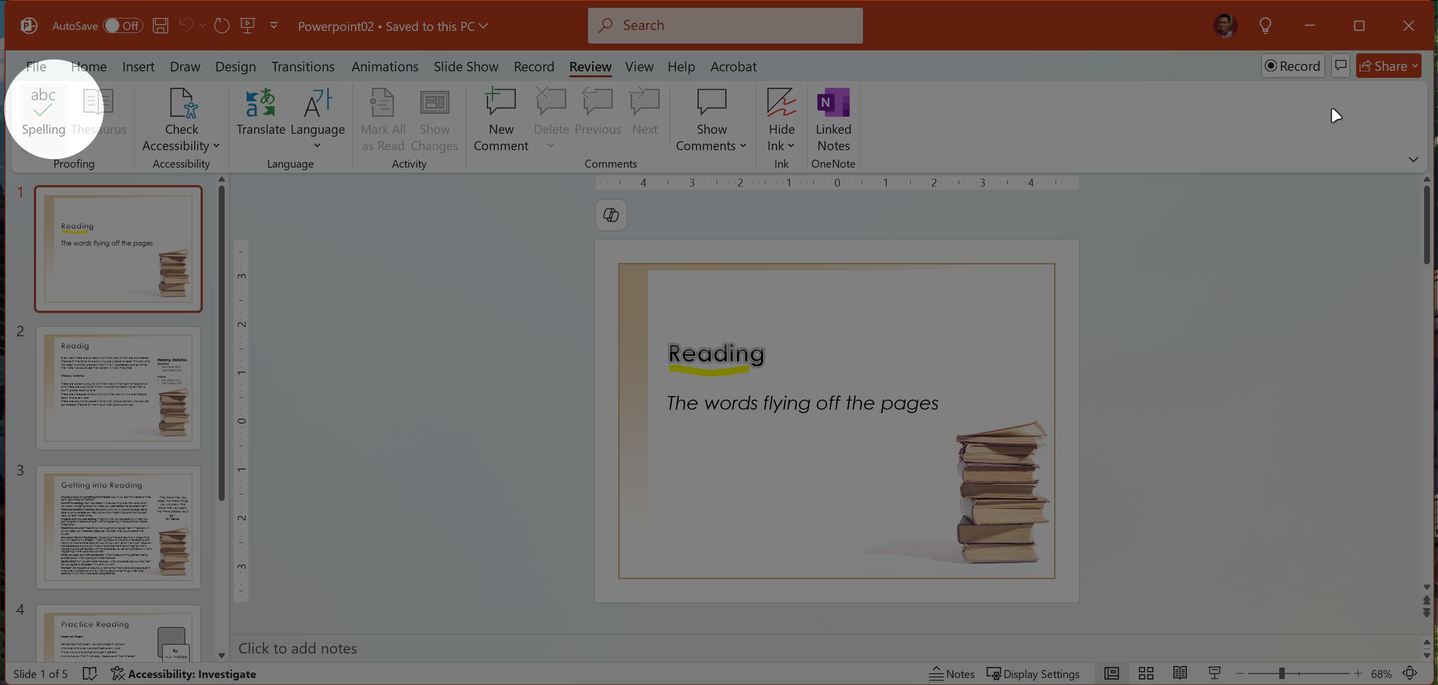 1. Review tab > Spelling.