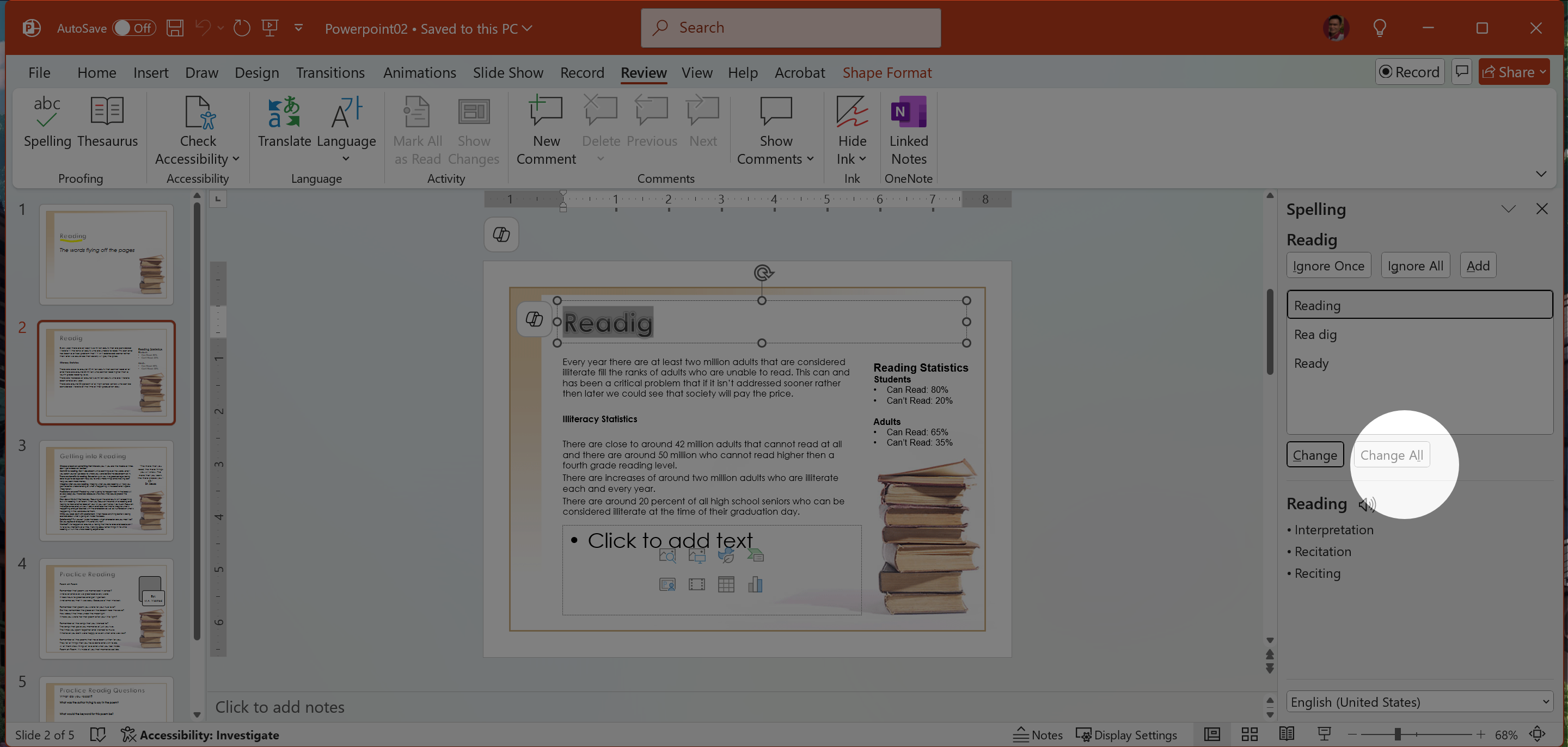 2. Trong bảng Spelling bên phải, chọn Reading > Change All.