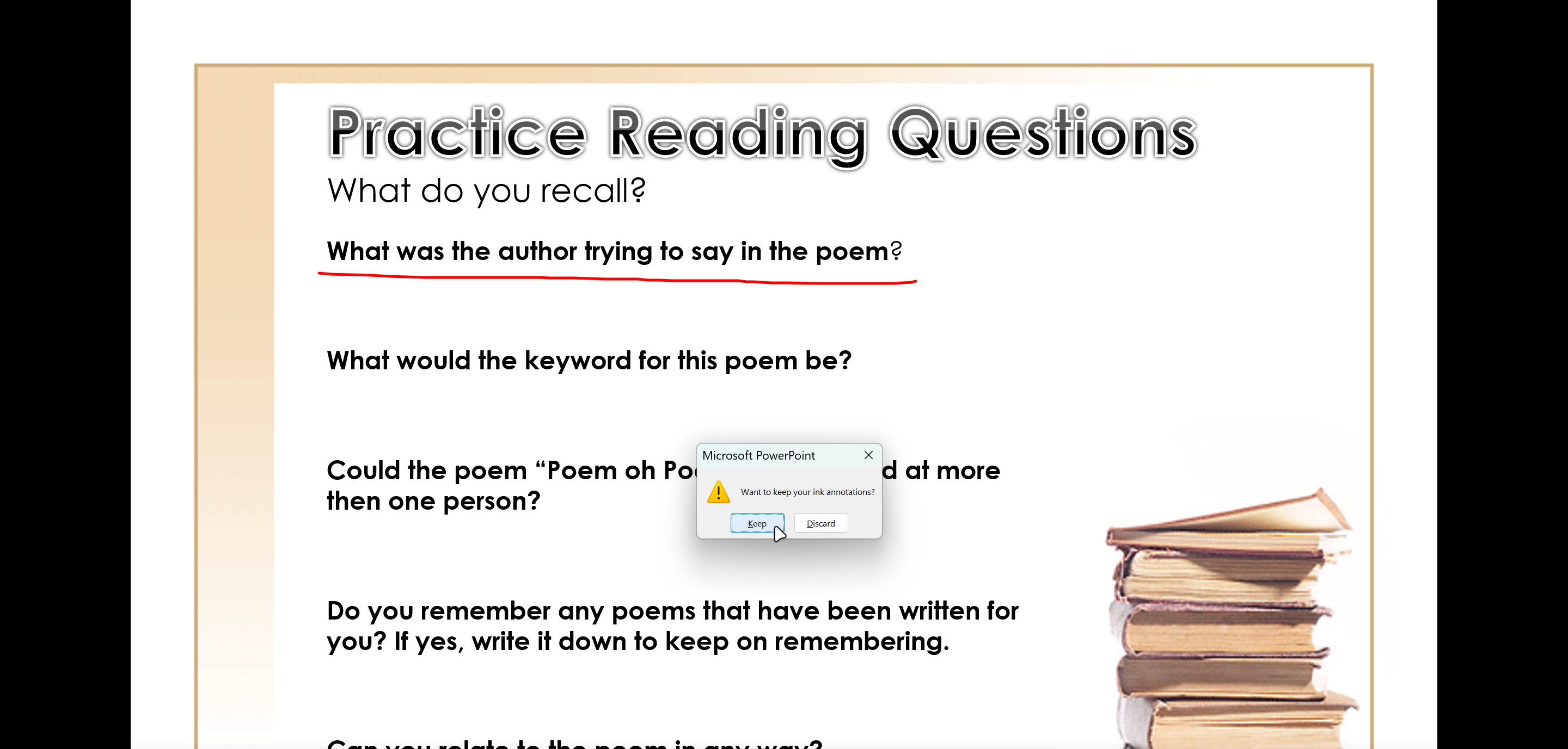 Create a Custom Slide Show with only the slide Practice Reading and the slide Practice Reading Questions.