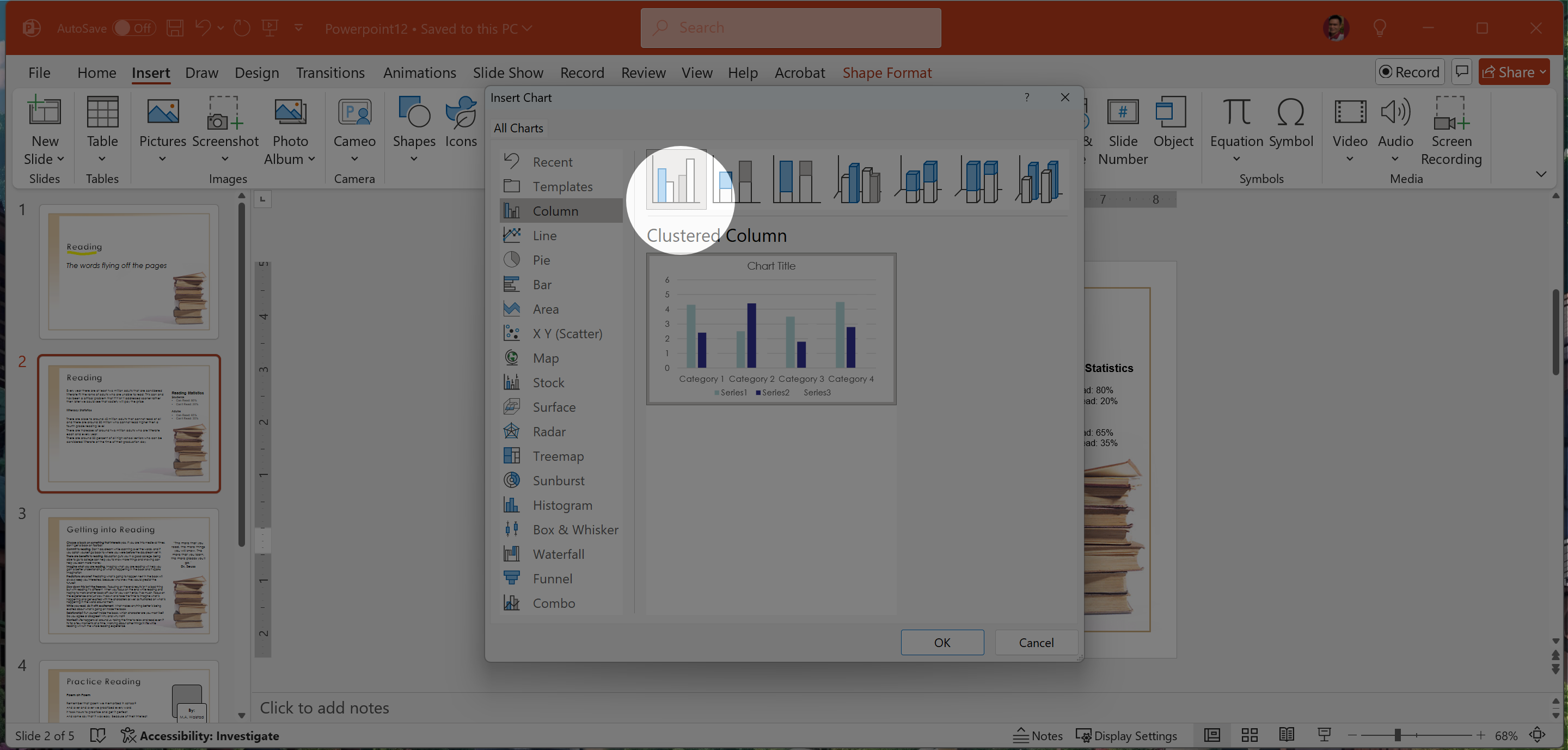 2. Insert Chart > Clustered Column > OK.