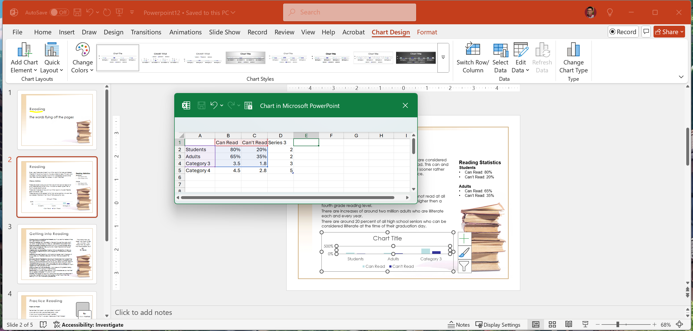 On Slide 2 insert a Clustered Column Chart inside the empty text box. Resize the Chart Data Range to include only 2 categories and 2 series. Rename the Categories: Students and Adults. Name the Series: Can Read and Can't Read. Insert the Datafrom the text box on Slide 2 called Reading Statistics.