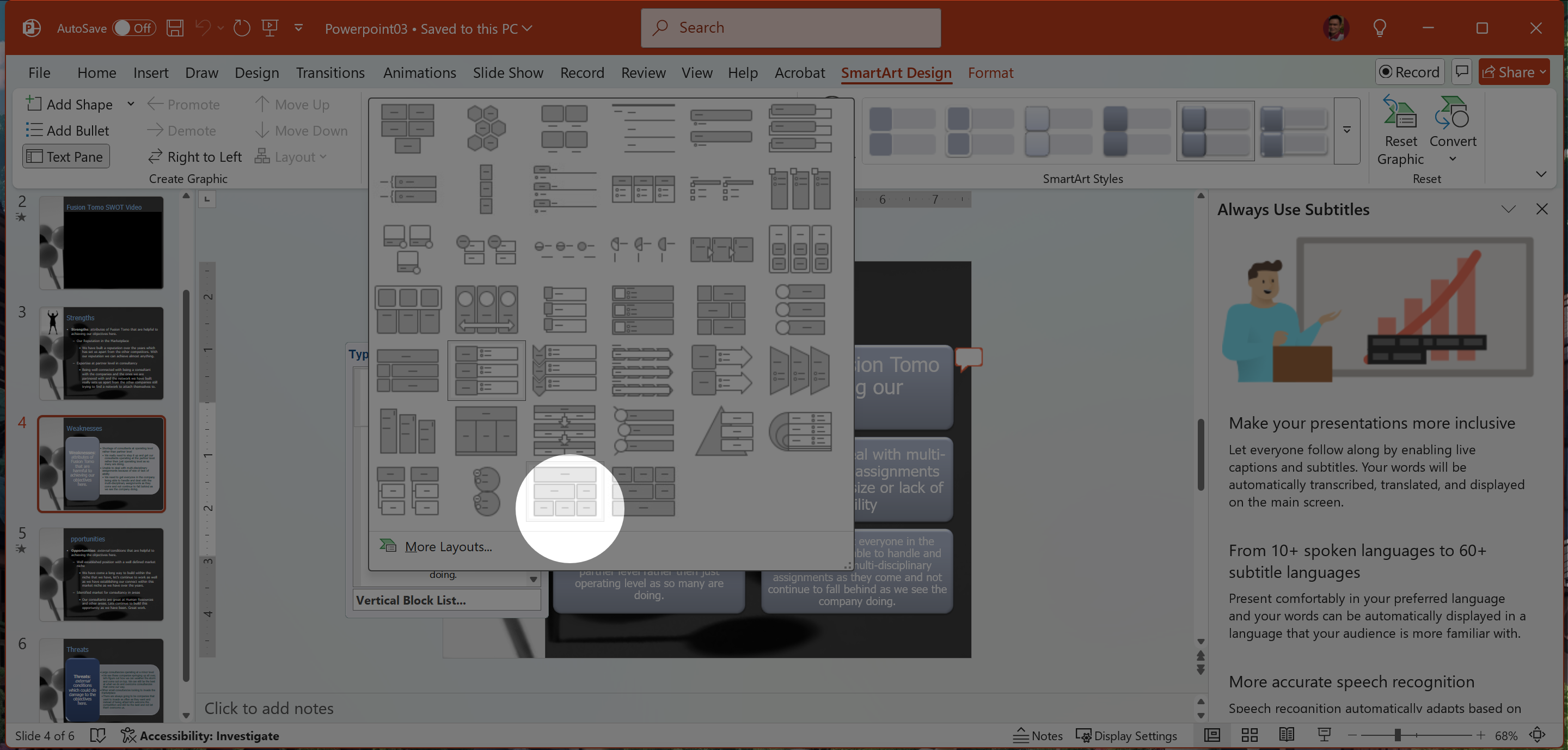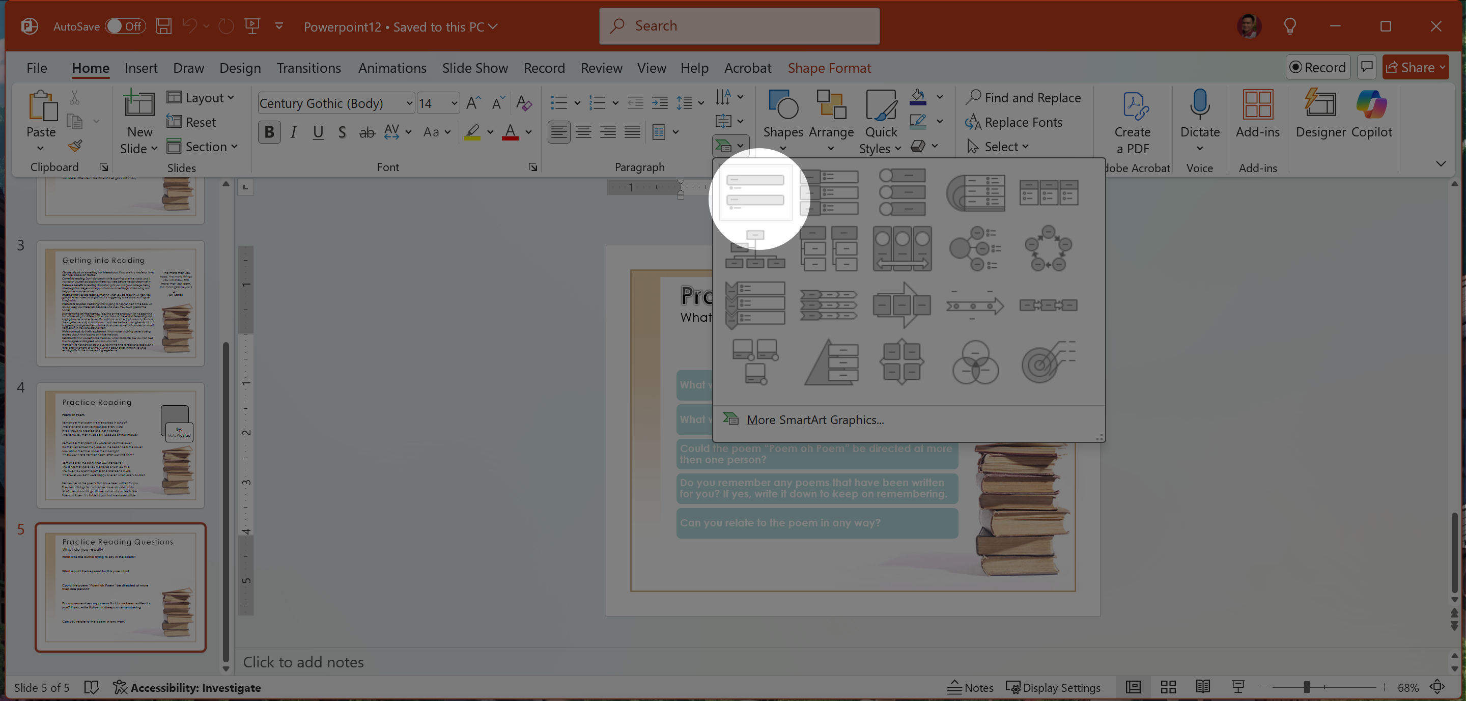 Convert the question list in Slide 5 to the Vertical Bullet List Smart Art.