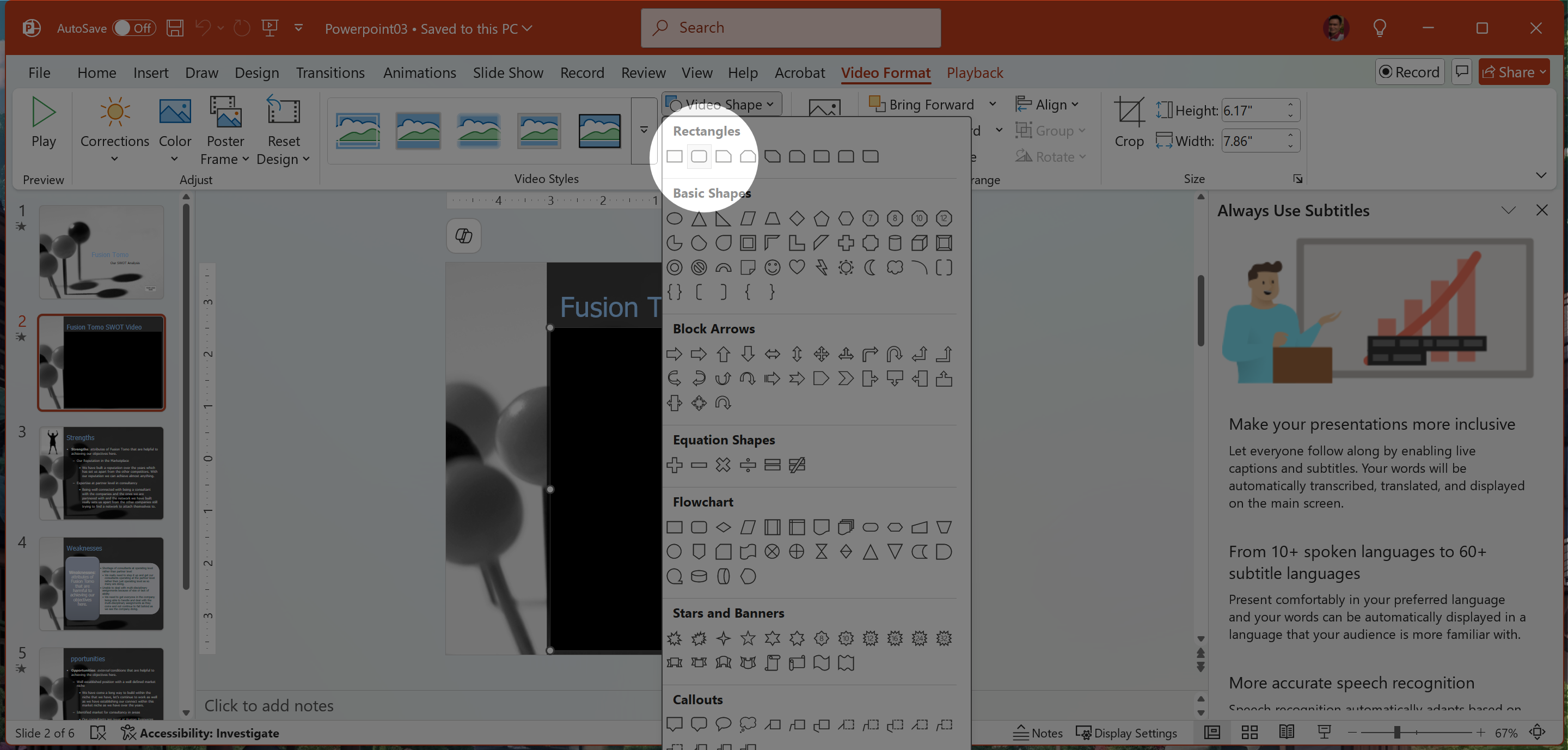 2. Video Tools/Format tab > Video Shape > Rectangle: Rounded Corners.