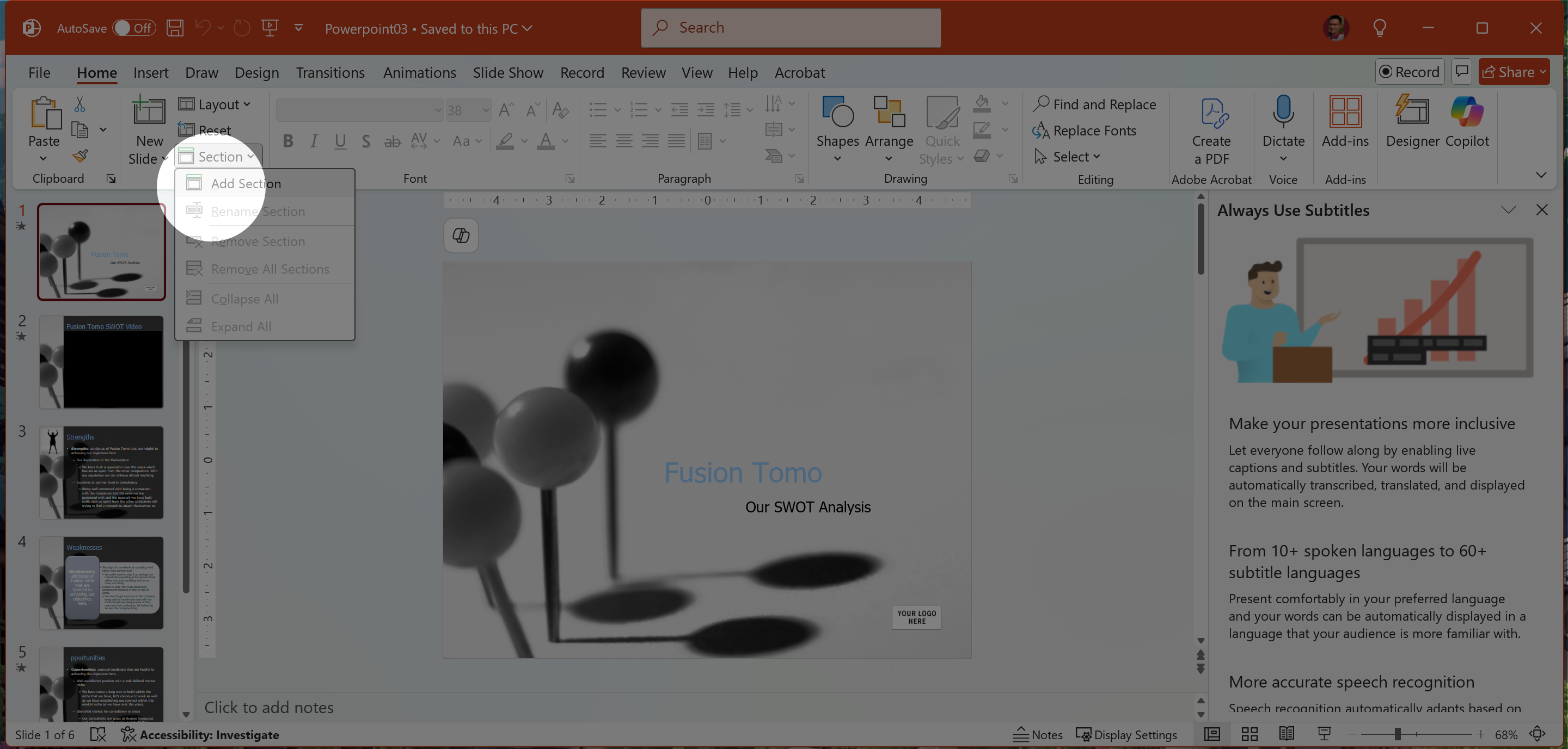 Add a section above Slide 1 named Introduction and a section above Slide 3 named SWOT.