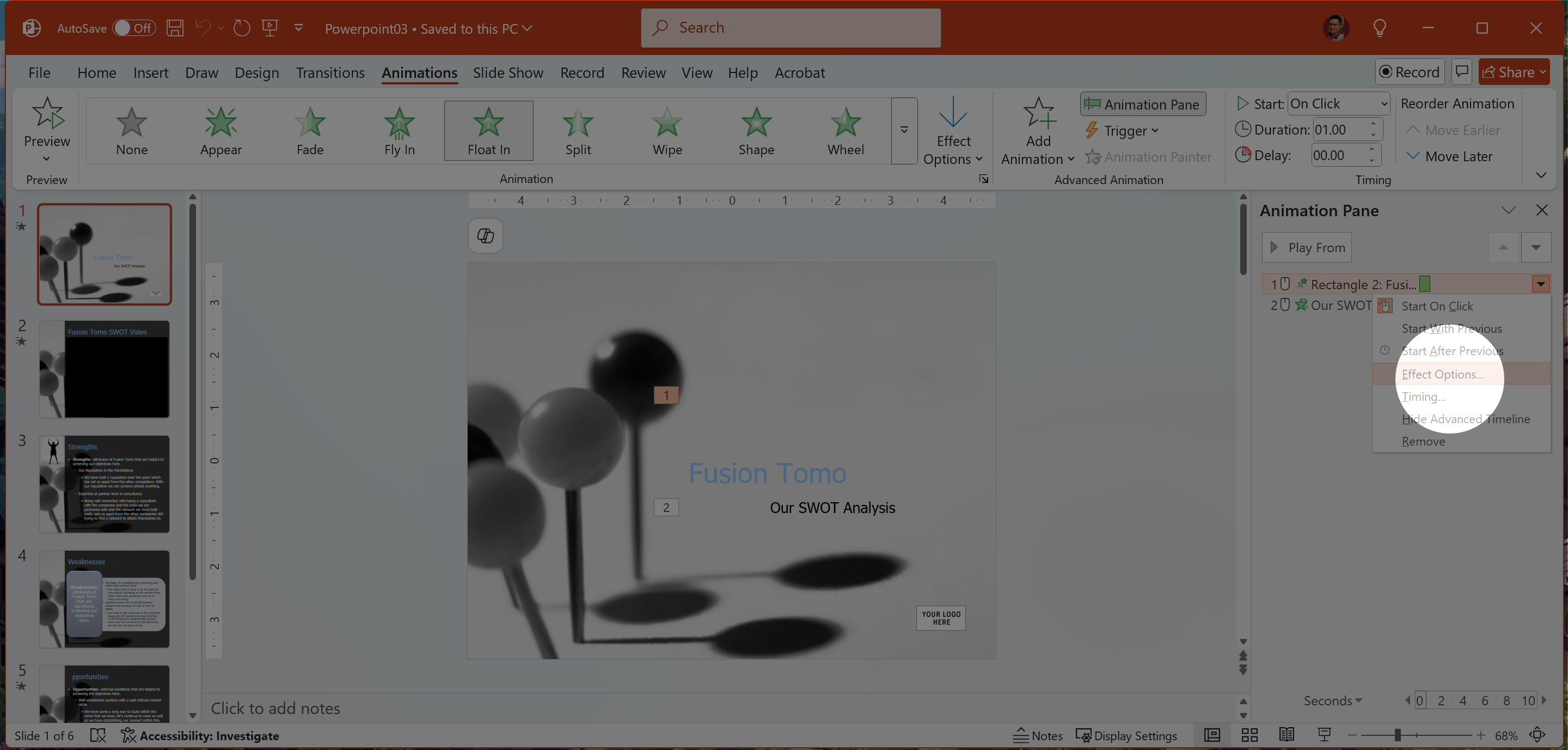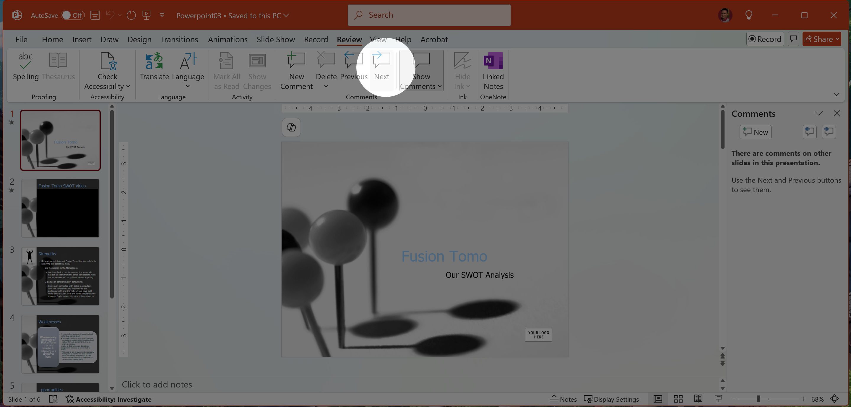 On Slide 2, select the words Fusion Tomo in the title and add a comment that says Delete Fusion Tomo so that the title is SWOT Video.