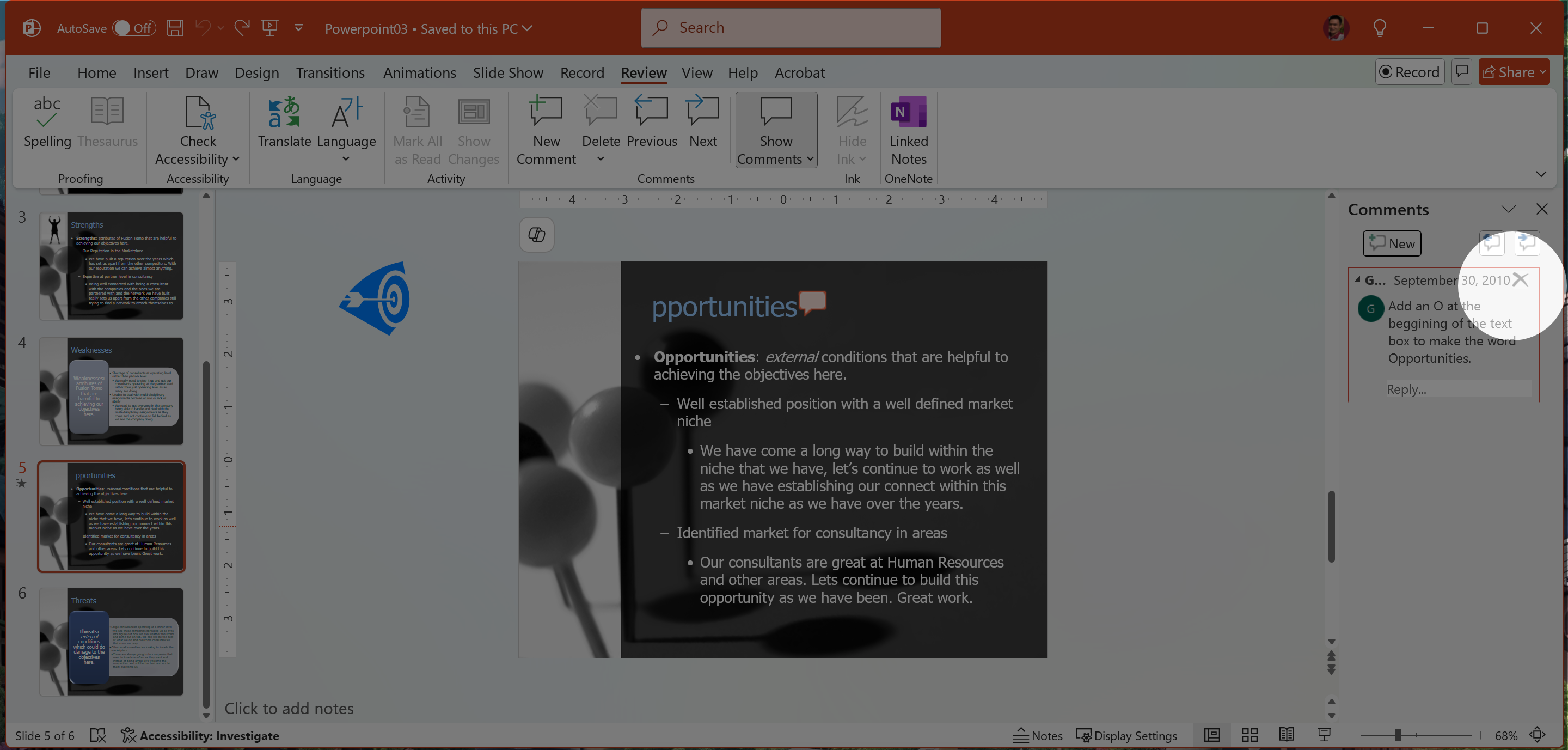 2. Review tab > New Comment > gõ Delete Fusion Tomo so that the title is SWOT Video.