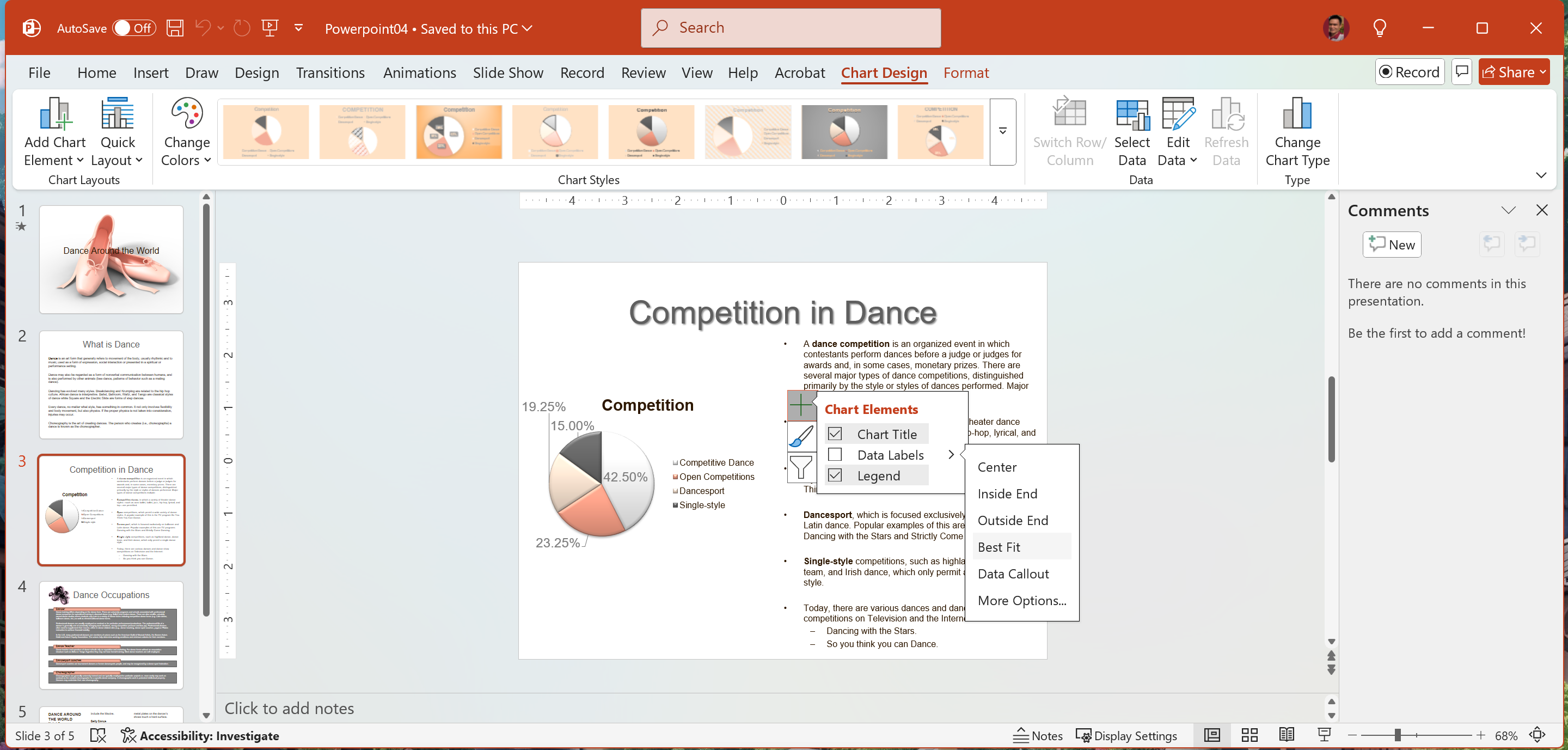 On Slide 3 format the Competition Chart to show the Data Labels at Best Fit.