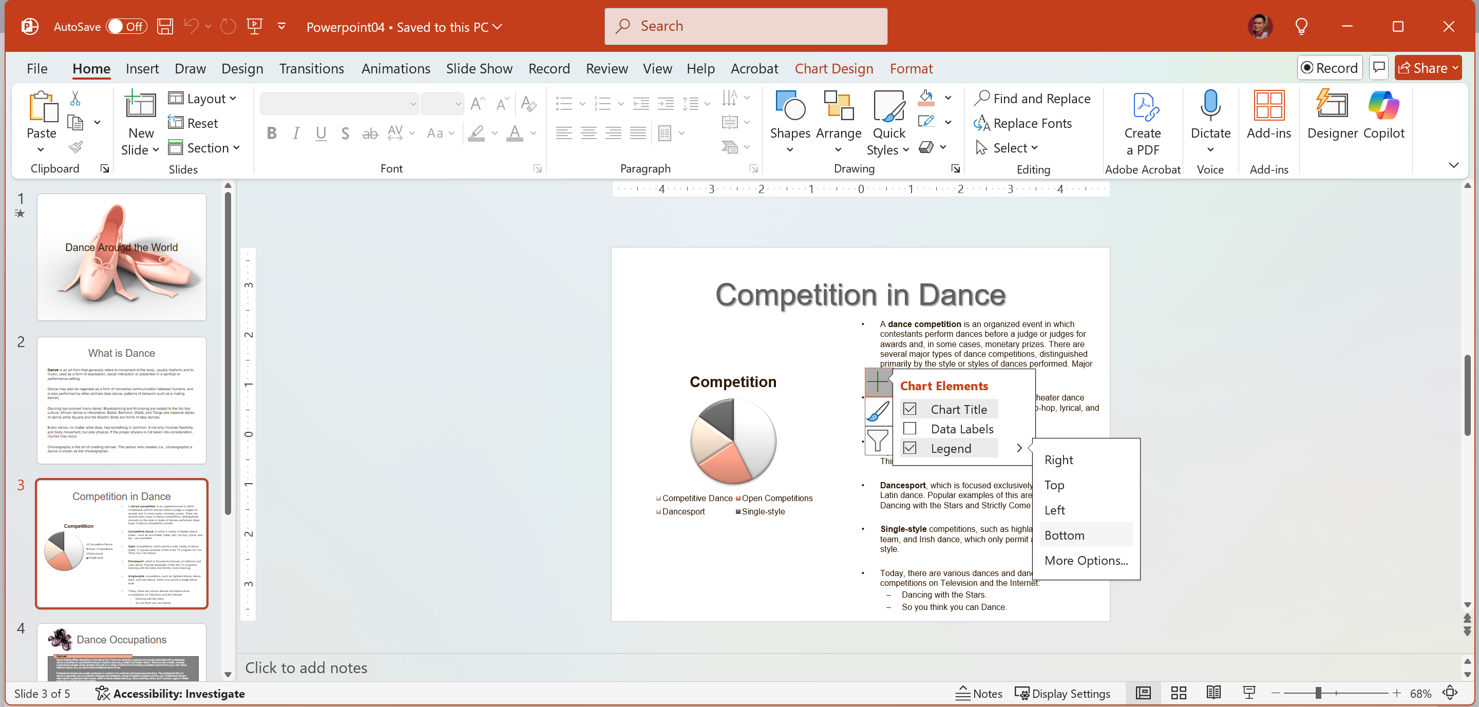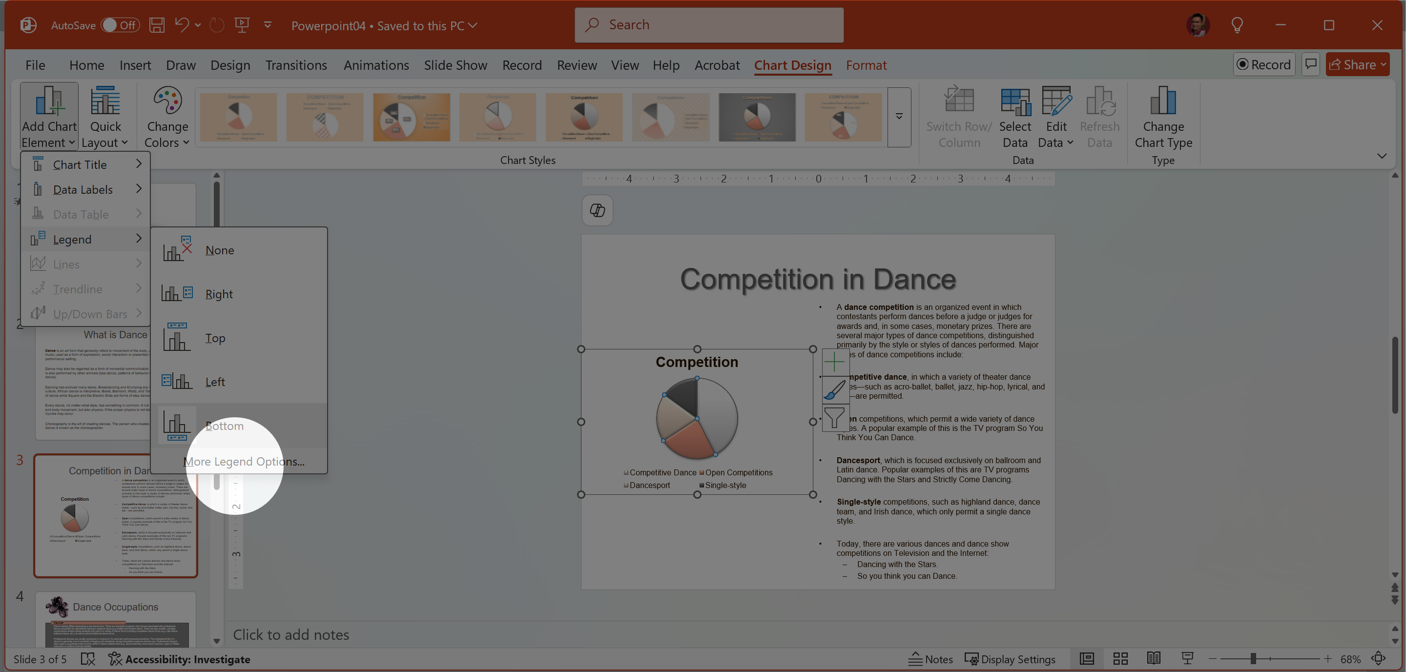 1. Chọn slide 3 > chọn biểu đồ > Chart Design tab > Add Chart Element > Legend > More Legend Options.