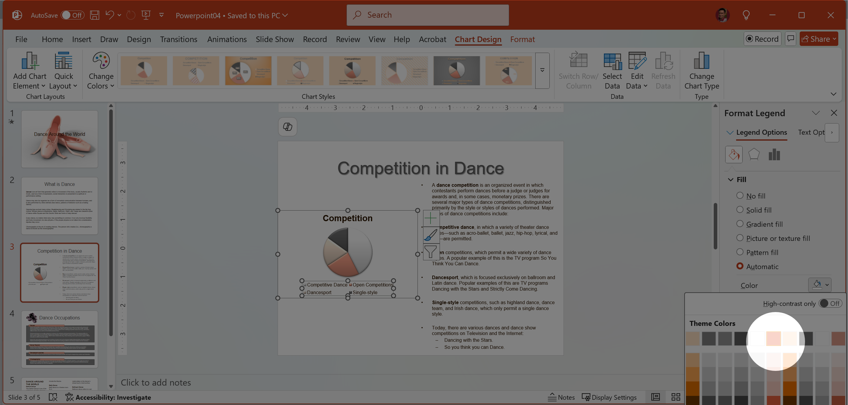 On Slide 3 format the chart Legend to be positioned at the Bottom with a Solid Fill of Rose, Accent 2.