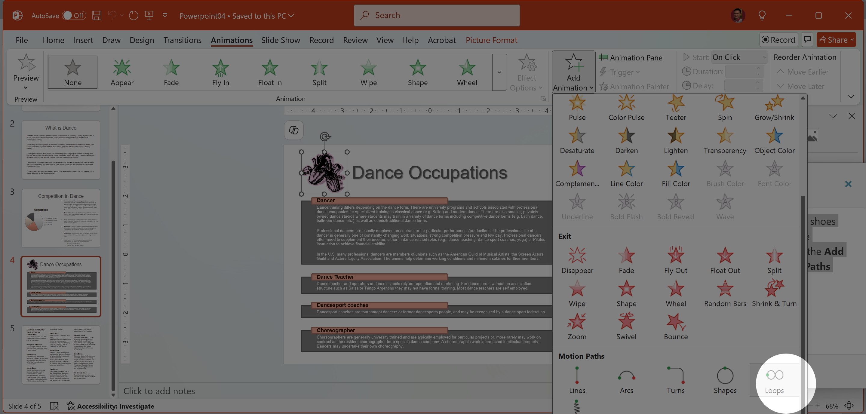 On Slide 4, apply the Loops motion path to the image.