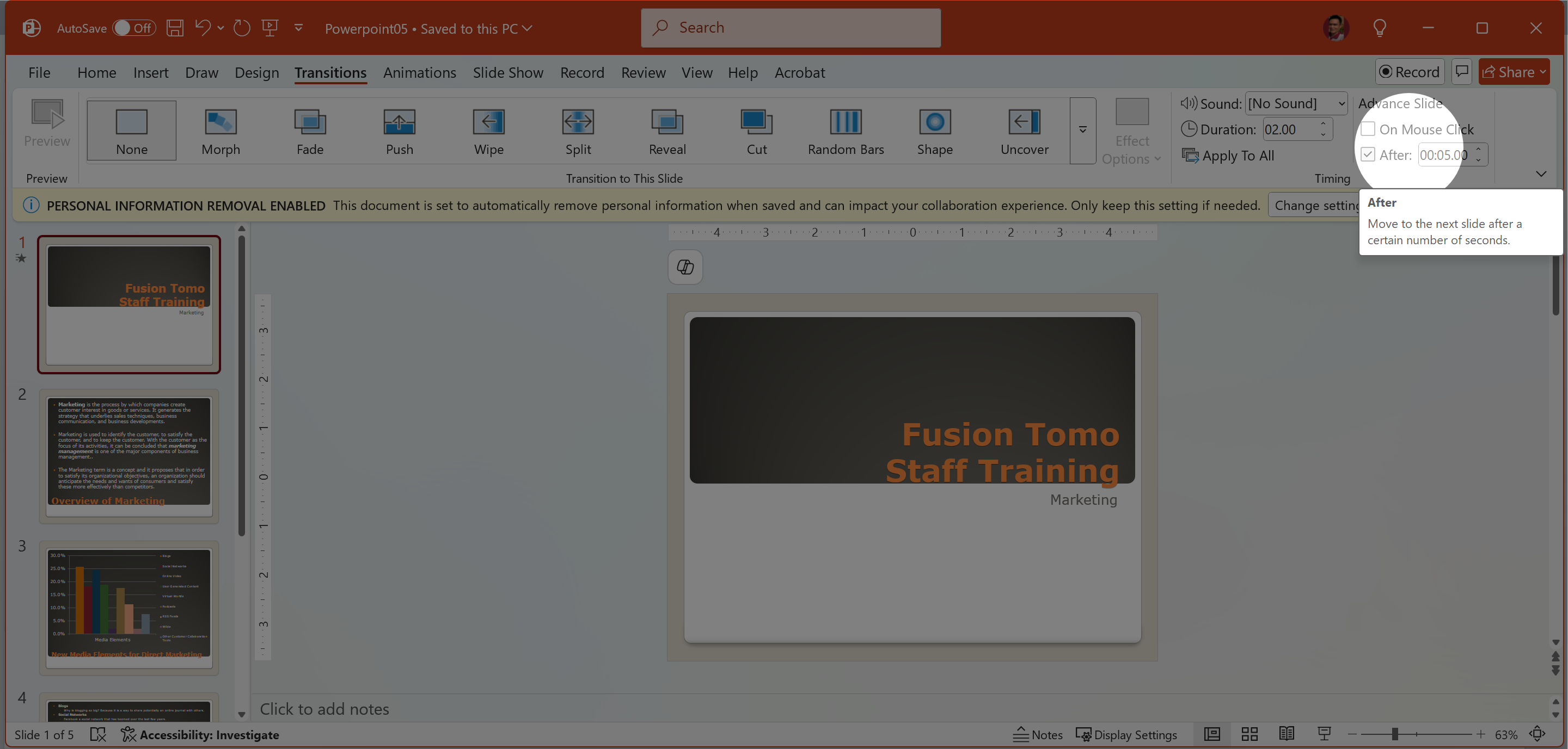 2. Transitions tab > Mục Advance Slide: bỏ chọn On Mouse Click > Đánh dấu chọn After > Gõ 00:05:00 (5 giây).