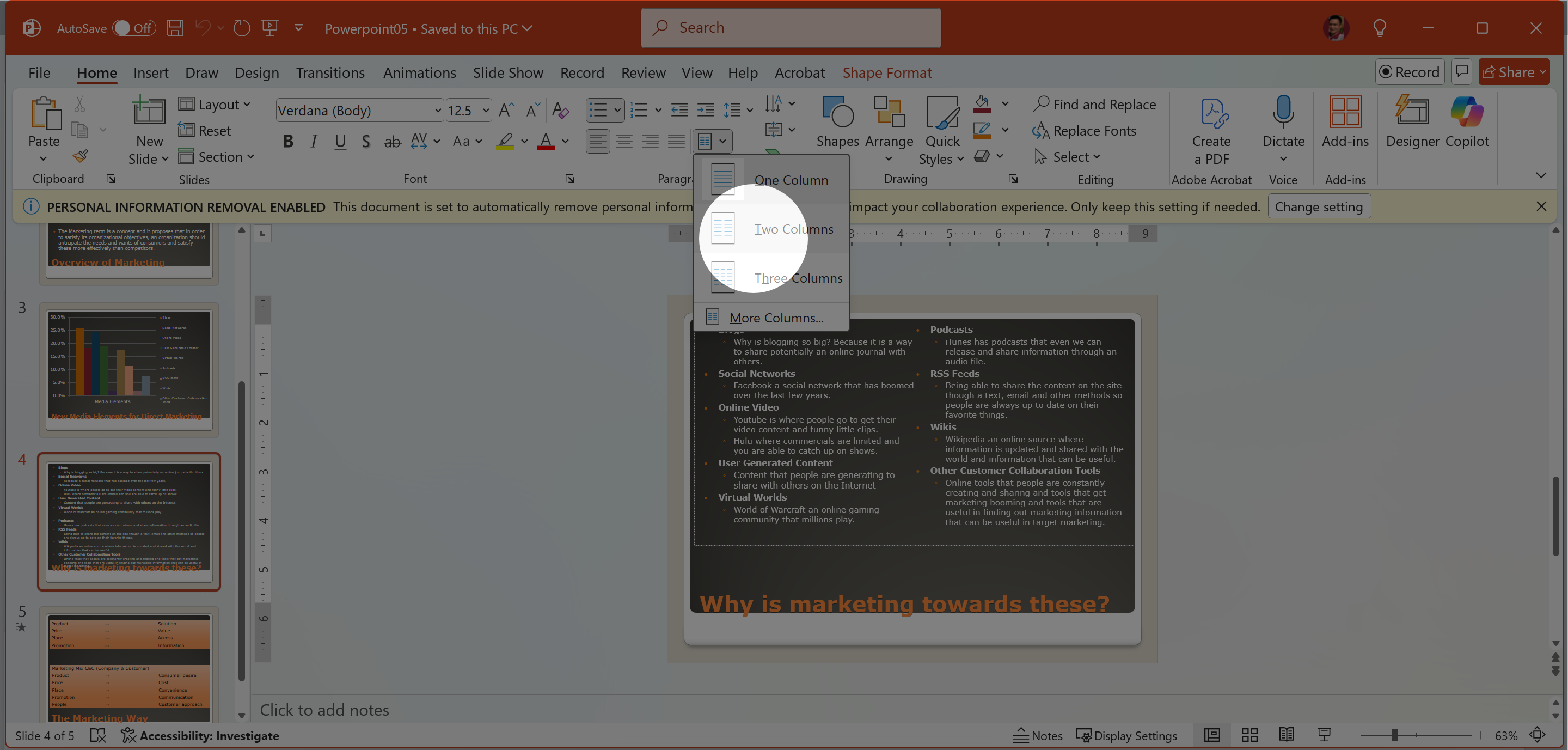 In Slide 4, set the text box with the bulleted list to have Two Columns.