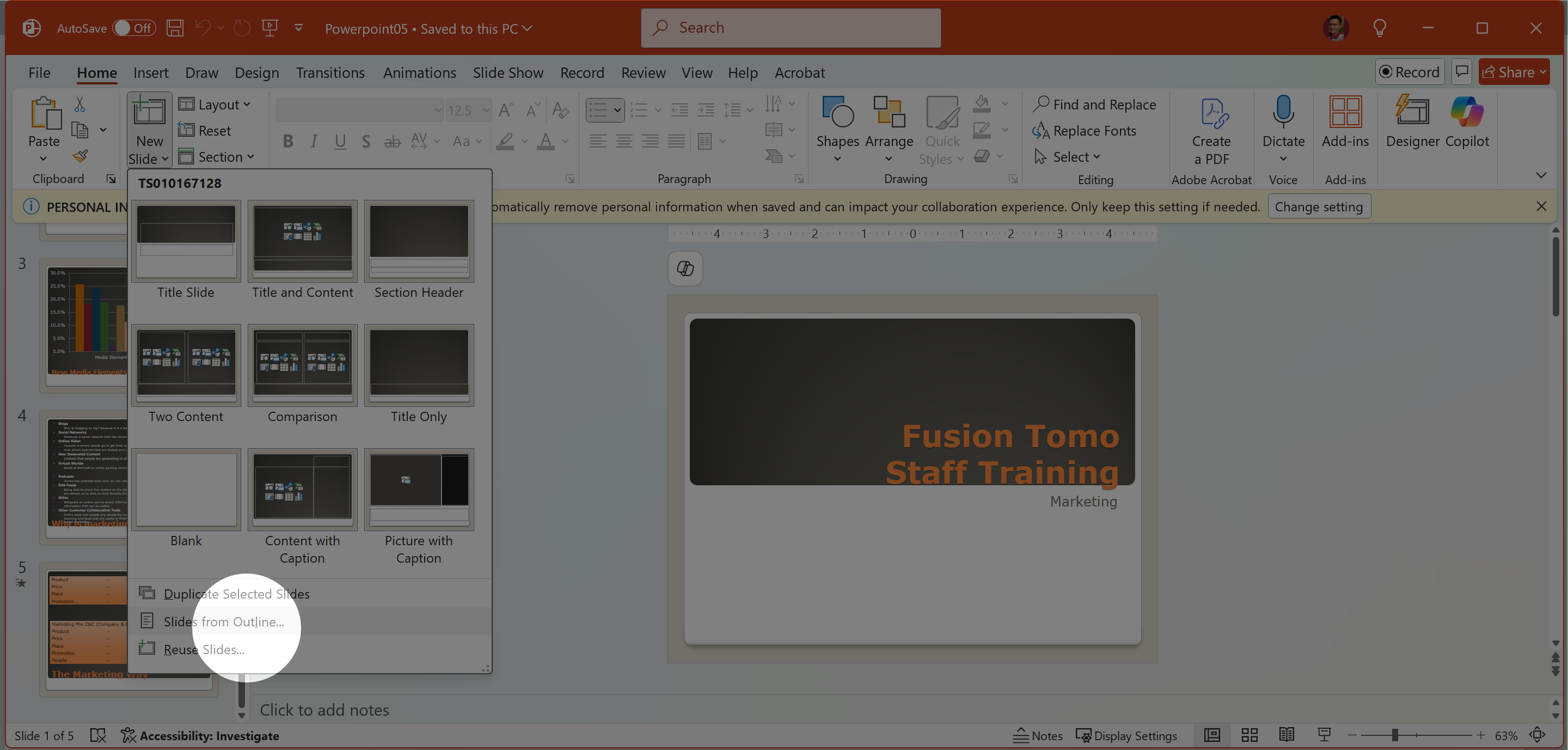 Insert additional slides to the end of the current slideshow using the outline file Outline.docx.