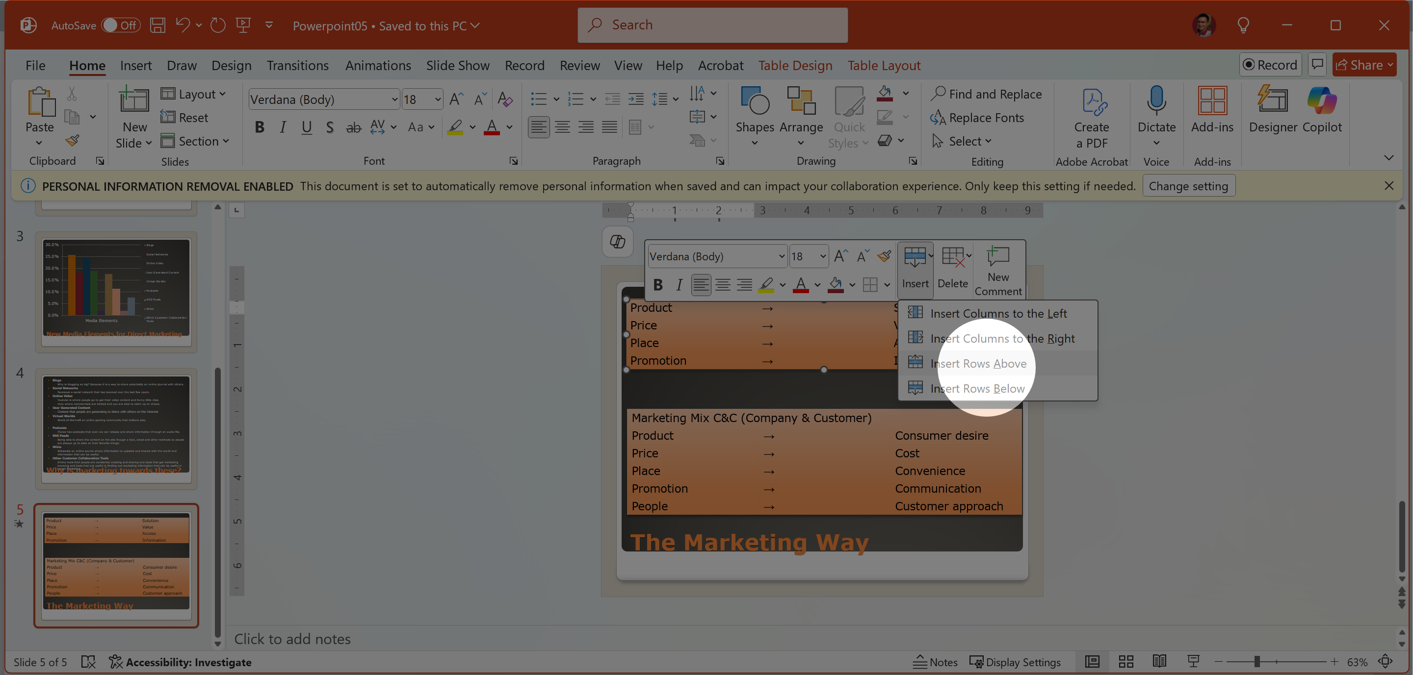 1. Chọn Slide 5 > click phải vào ô bất kỳ trong hàng đầu tiên > Insert > Insert Above.