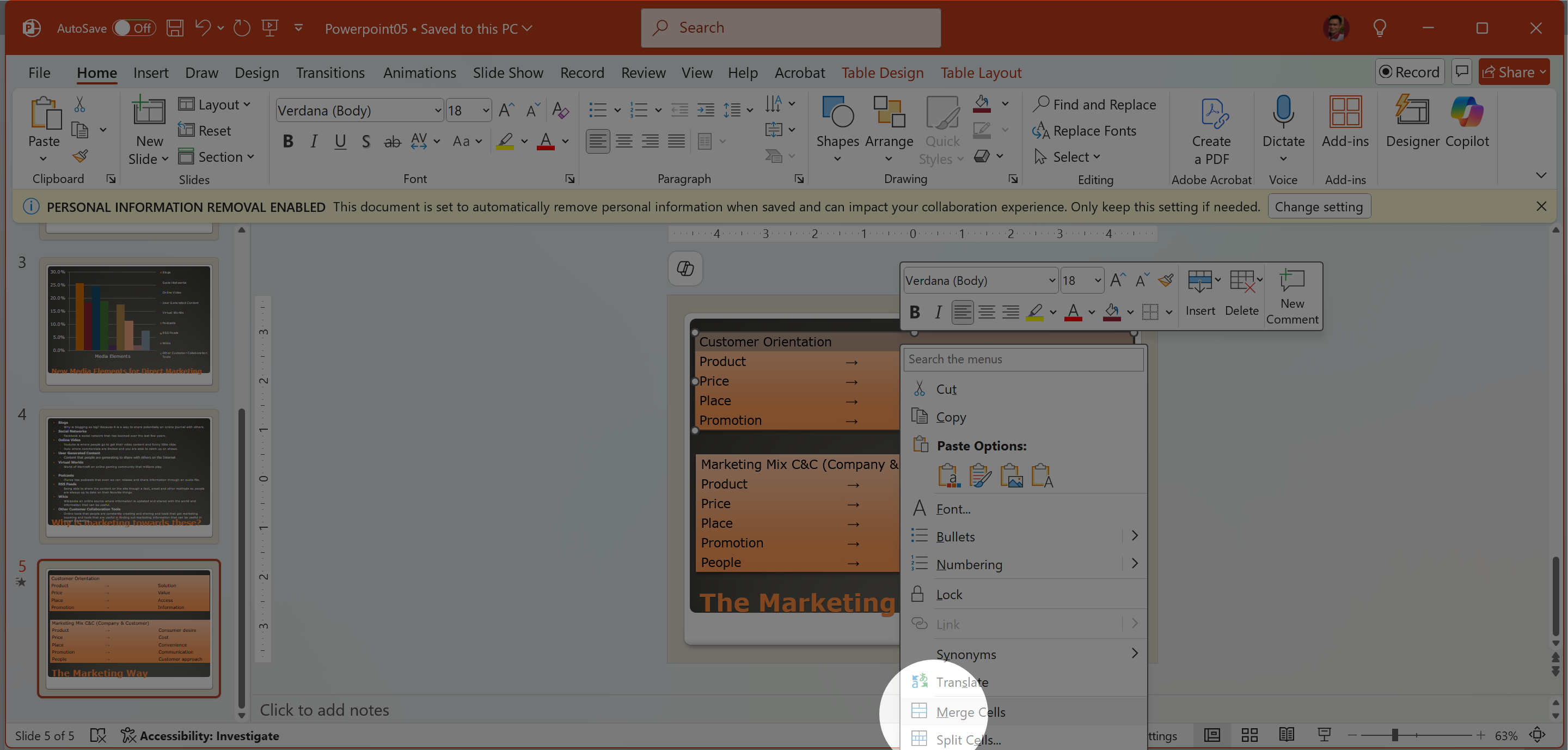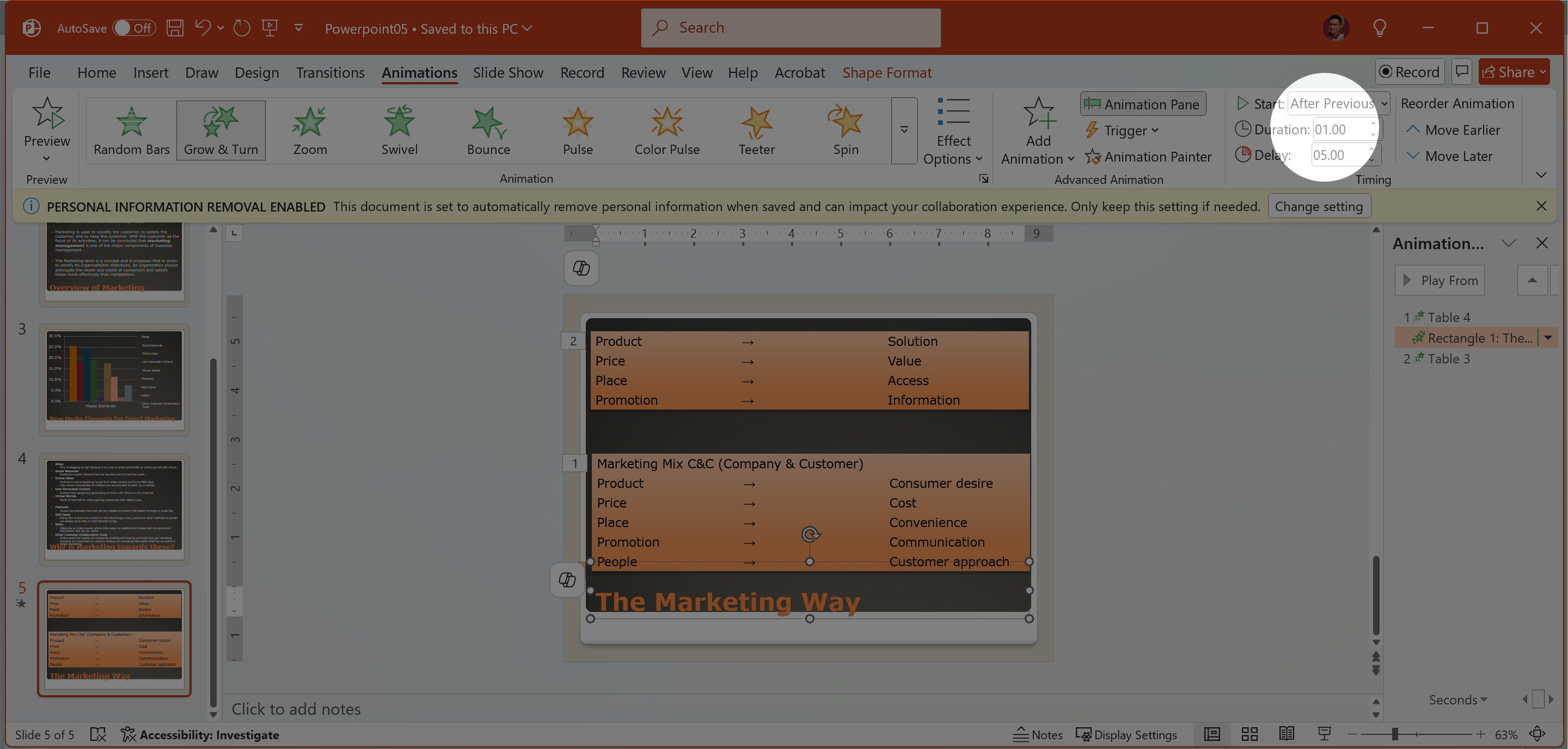 On Slide 5, change the animation of the text box The Marketing Way to start After Previous with a 5.00 second delay.