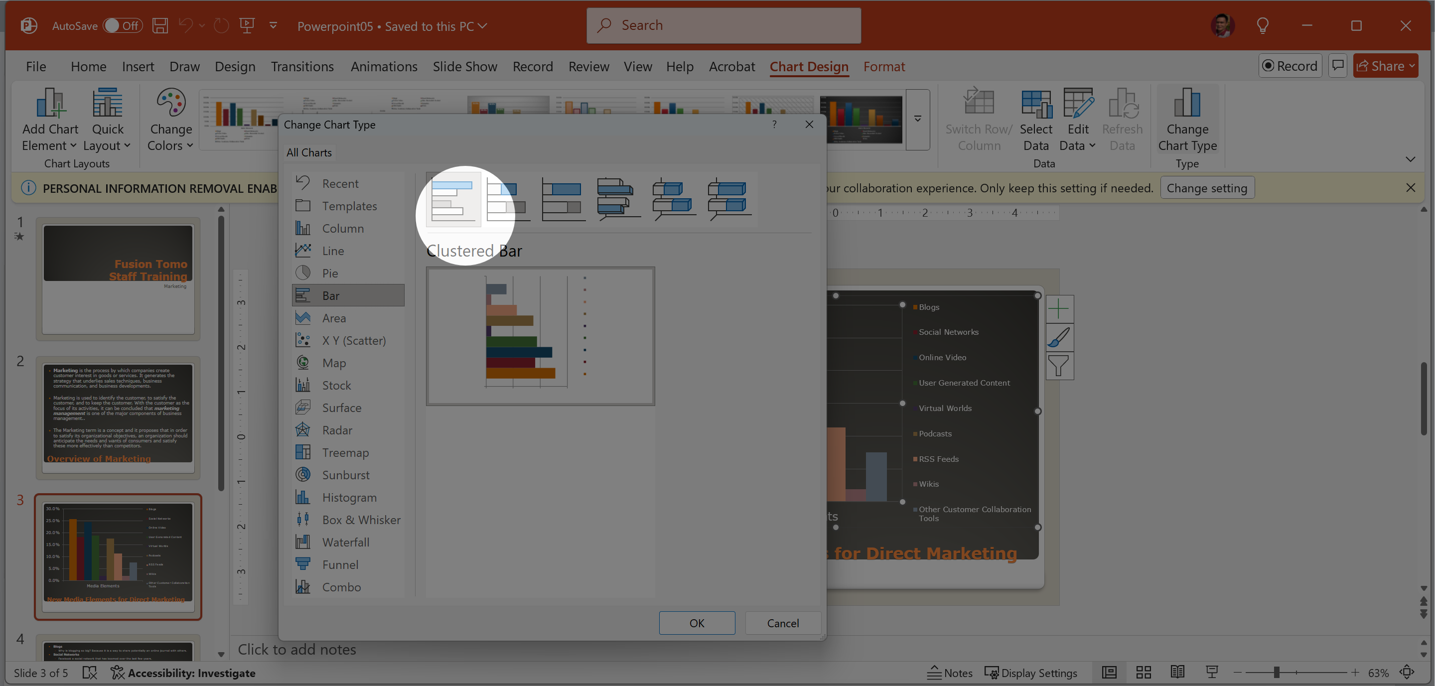 On Slide 3 change the Chart Type to Clustered Bar.