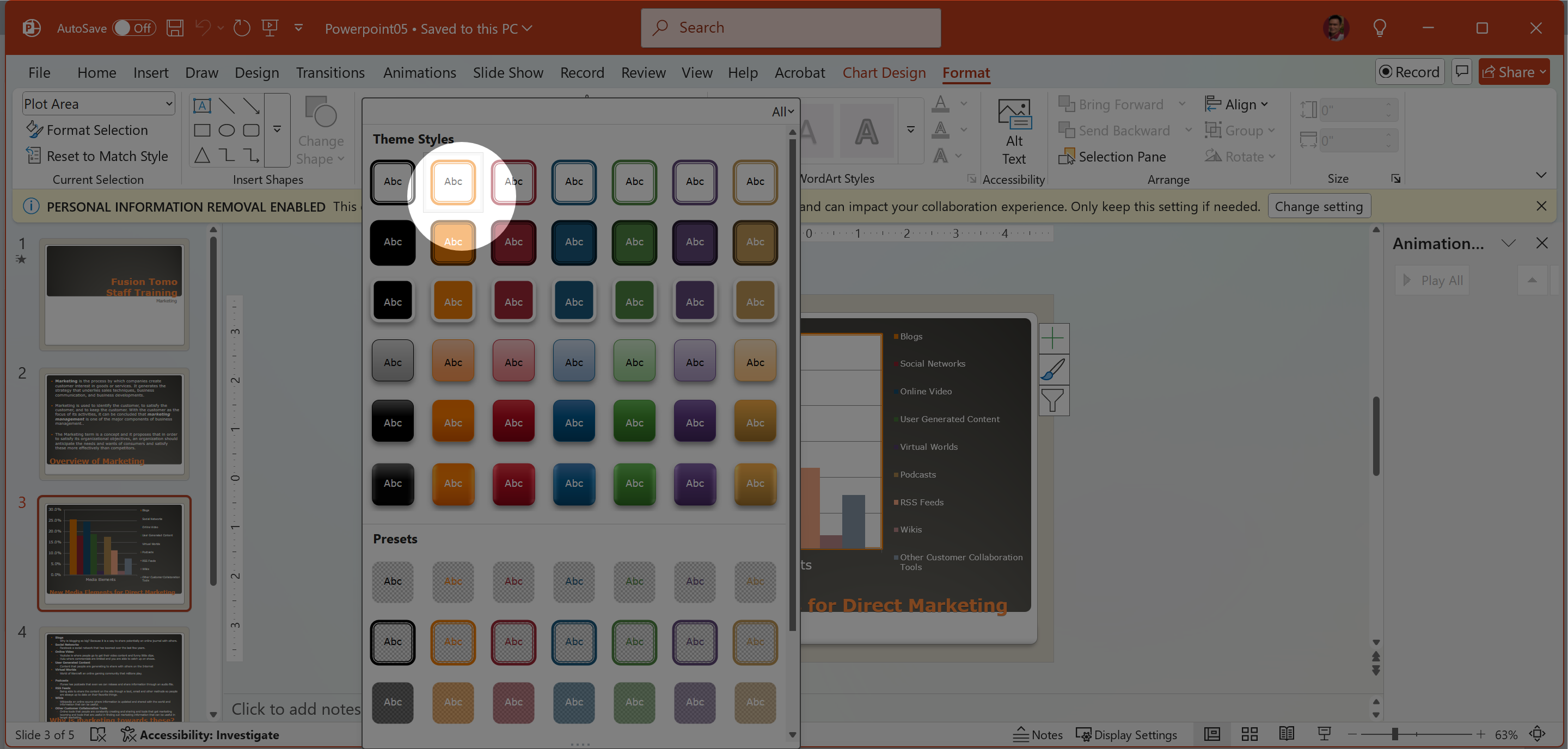 On Slide 3 apply the Shape Style Colored Outline - Orange, Accent 1 to the Chart. Nhớ chỉ chọn đường viền ngoài của biểu đồ.