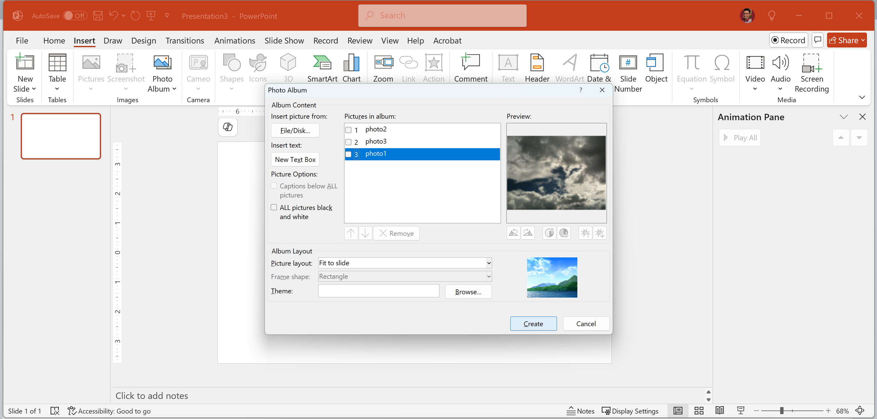 Create a New Photo Album and insert the pictures photo1.jpg, photo2.jpg and photo3.jpg. These images can be found in your GMetrix Templates folder. Order the pictures by photo2.jpg first, photo3.jpg second, and photo1.jpgthird.