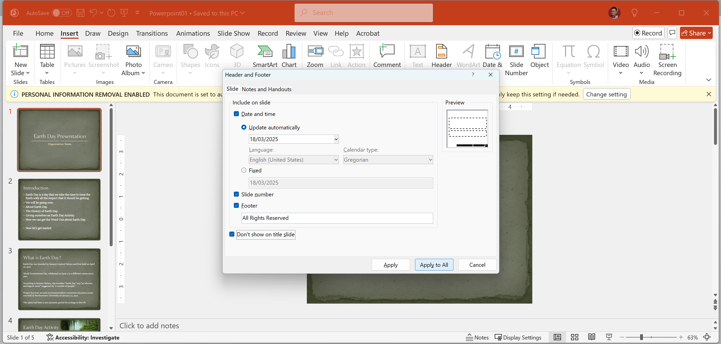 Apply a footer to all of the slides in the presentation except the title slide. The footer should include the date and time set to update automatically, the slide number, and a footer that reads: All Rights Reserved. Accept all other defaults.