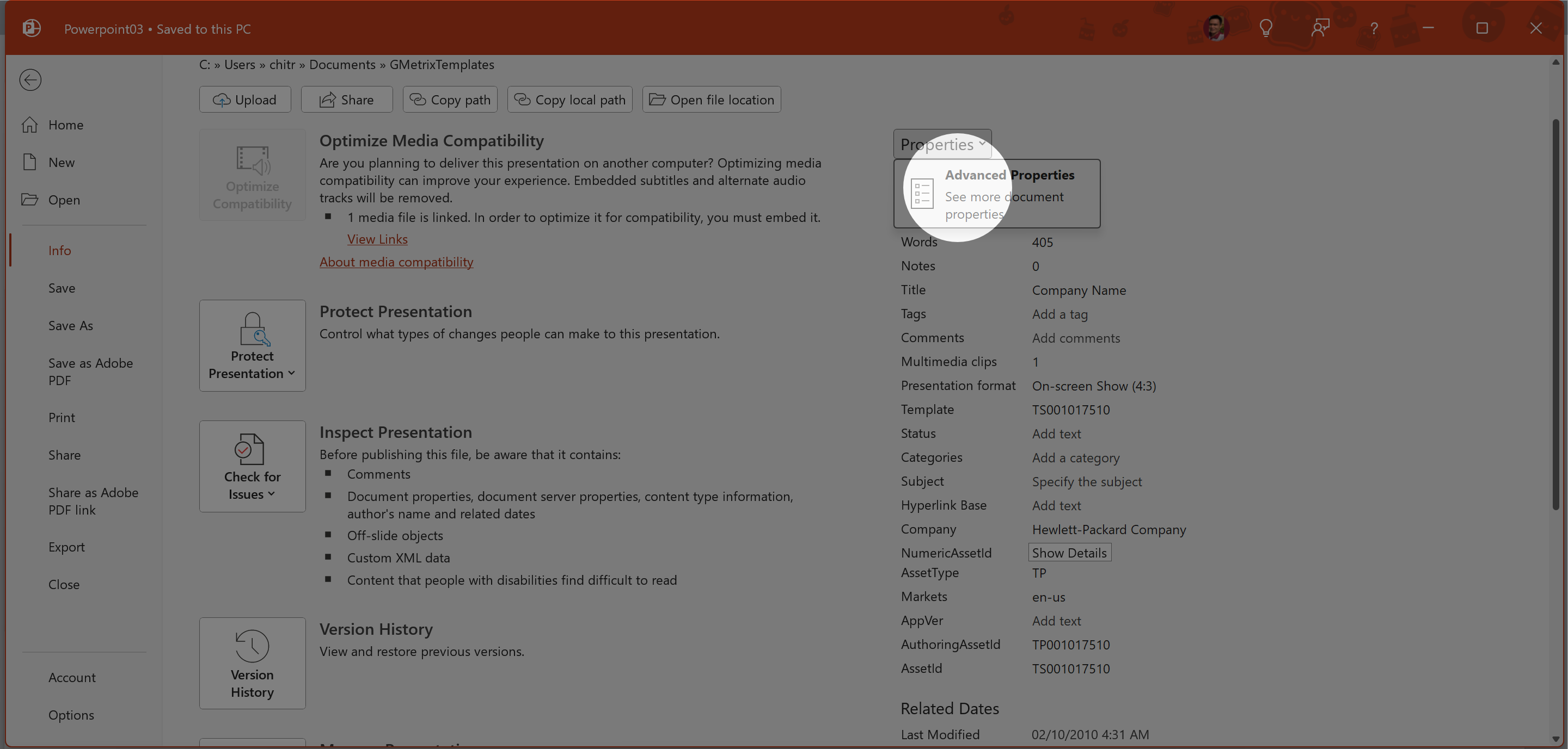 1. File tab > Info > Properties > Advanced Properties.