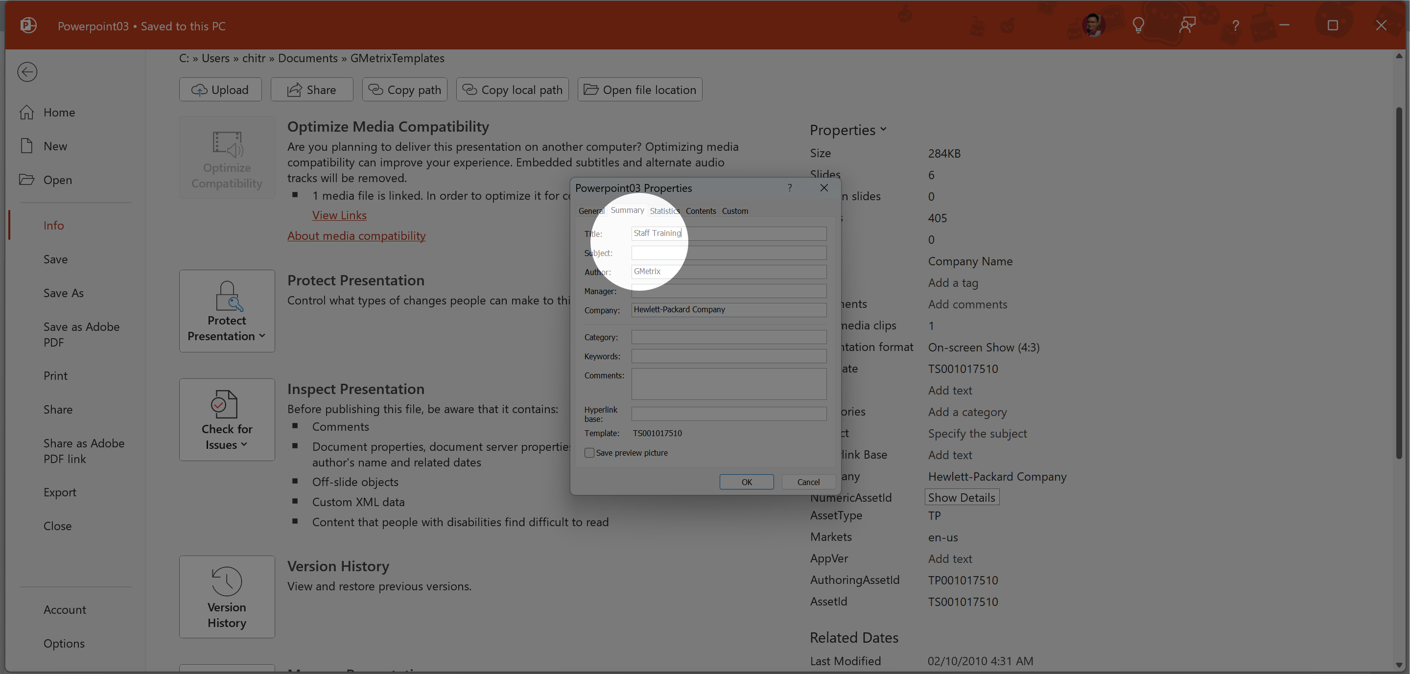 2. Trong hộp thoại hiện ra, chọn Summary tab > mục Title: gõ Staff Training > OK.